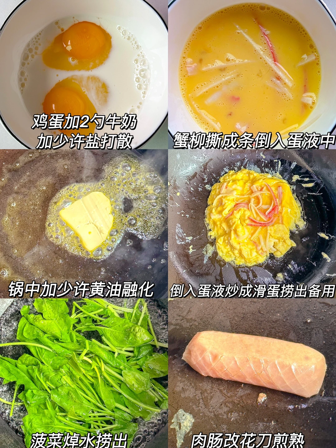 1️⃣鸡蛋➕2勺牛奶➕少许盐打散,蟹柳撕成条倒入蛋液中,锅中加一小块黄油融化,倒入蛋液炒成滑蛋捞出