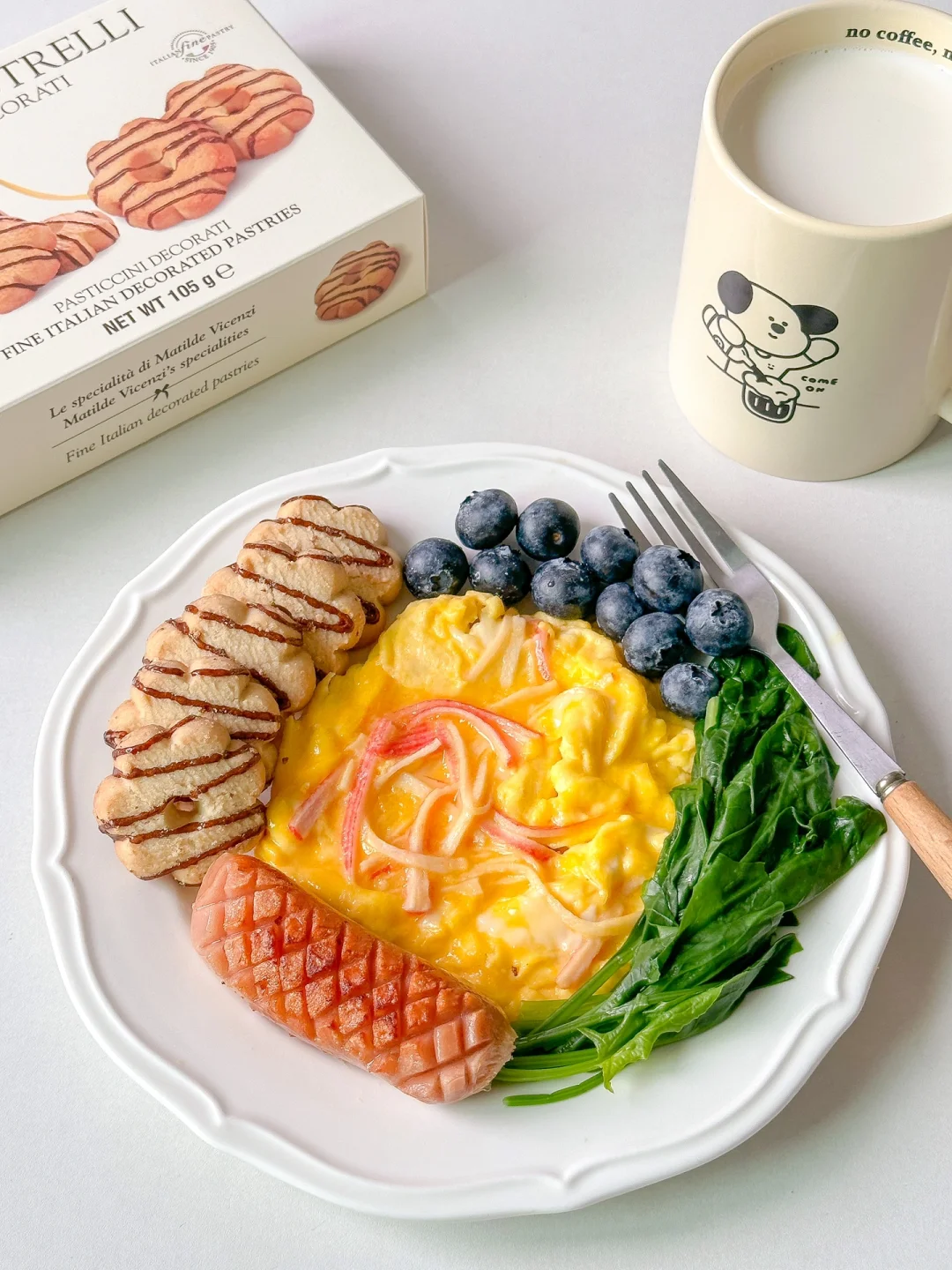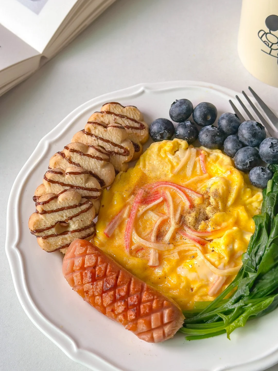 鸡蛋2颗 蟹柳1根 肉肠1根 菠菜一小把 蓝莓 花朵饼干