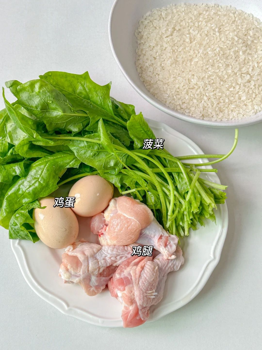 鸡腿3个 鸡蛋2颗 菠菜一把 米饭