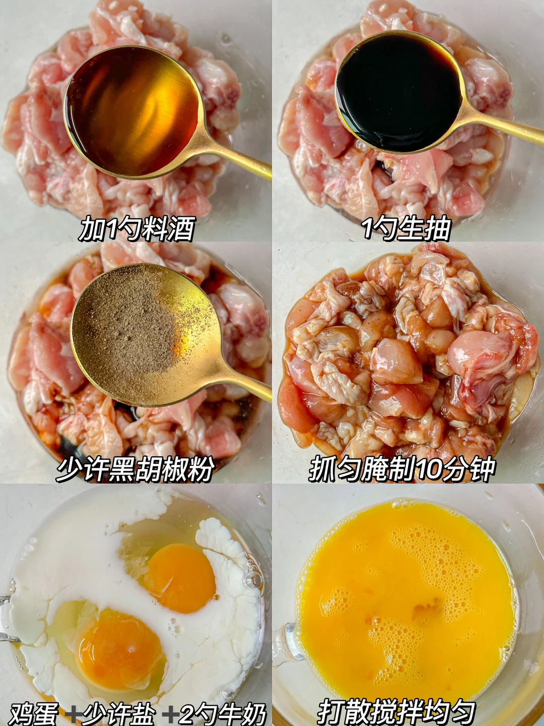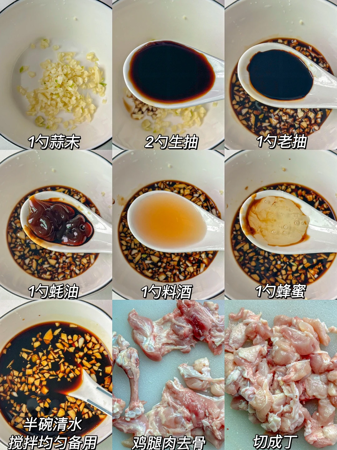 2️⃣鸡腿肉去骨切丁➕1勺料酒➕1勺生抽➕少许黑胡椒粉抓匀腌制10分钟