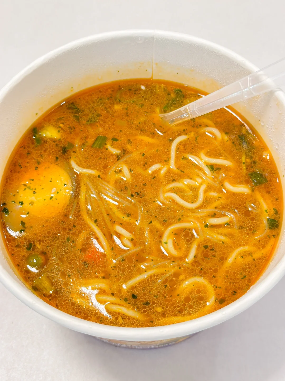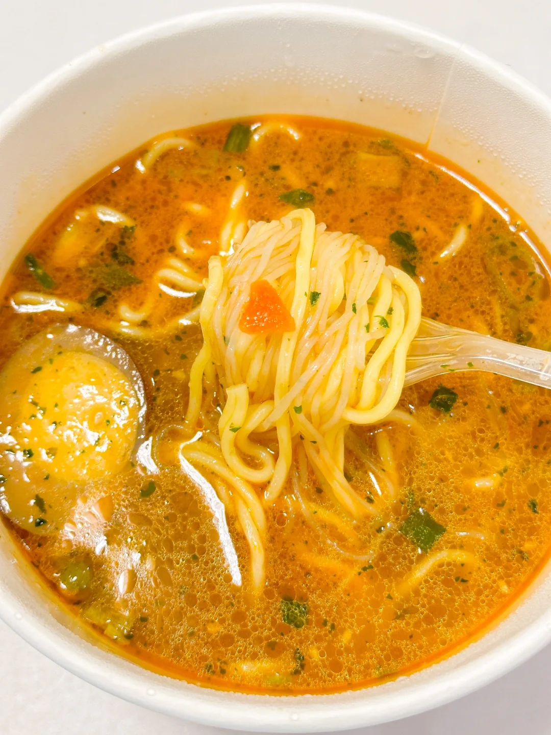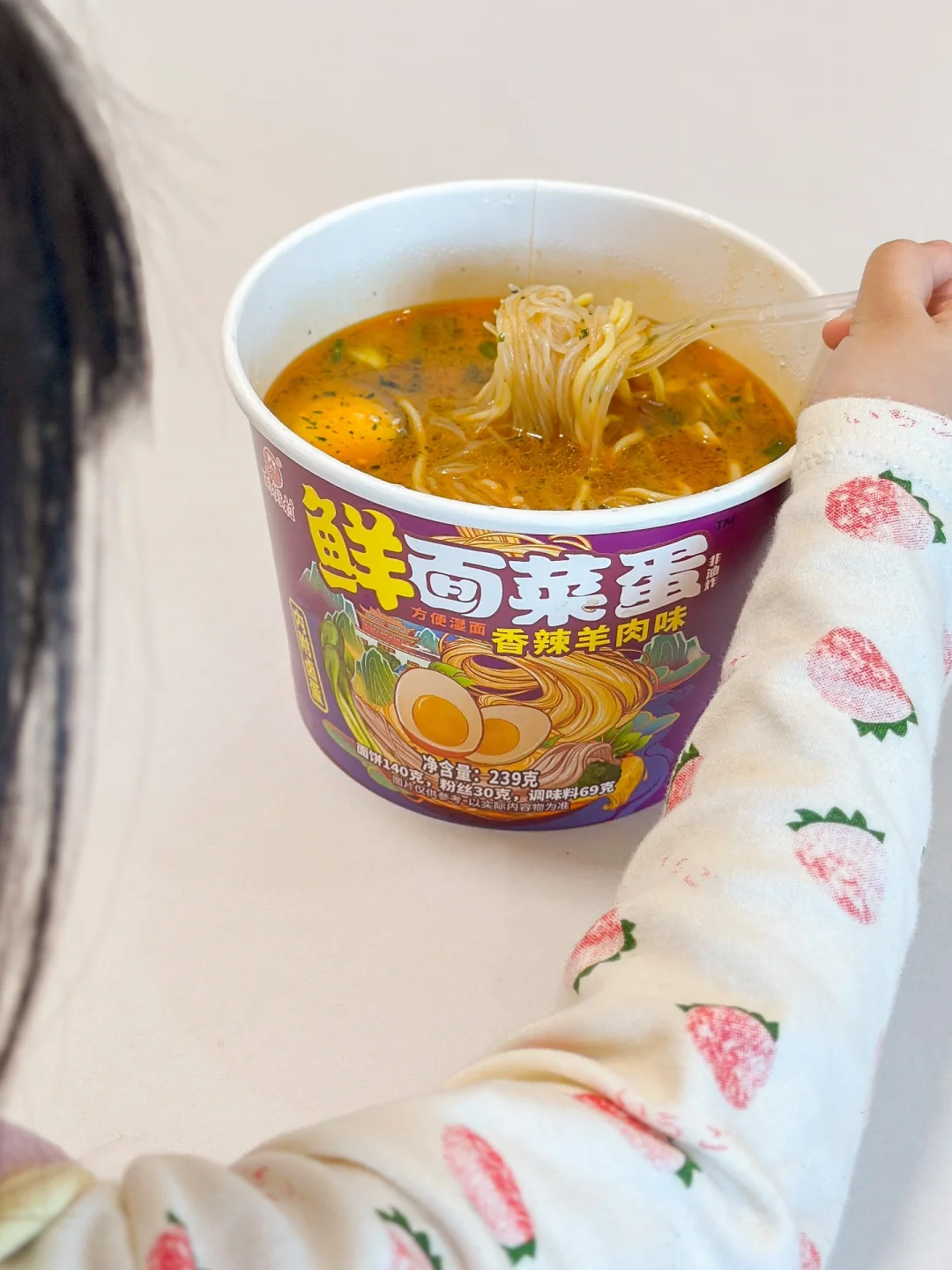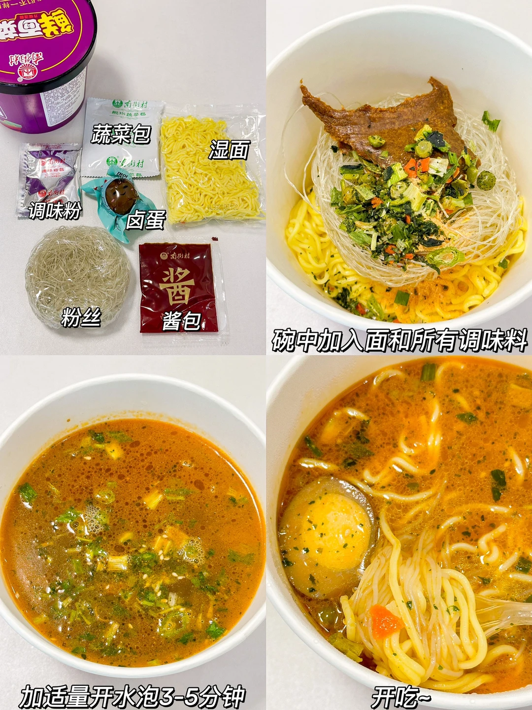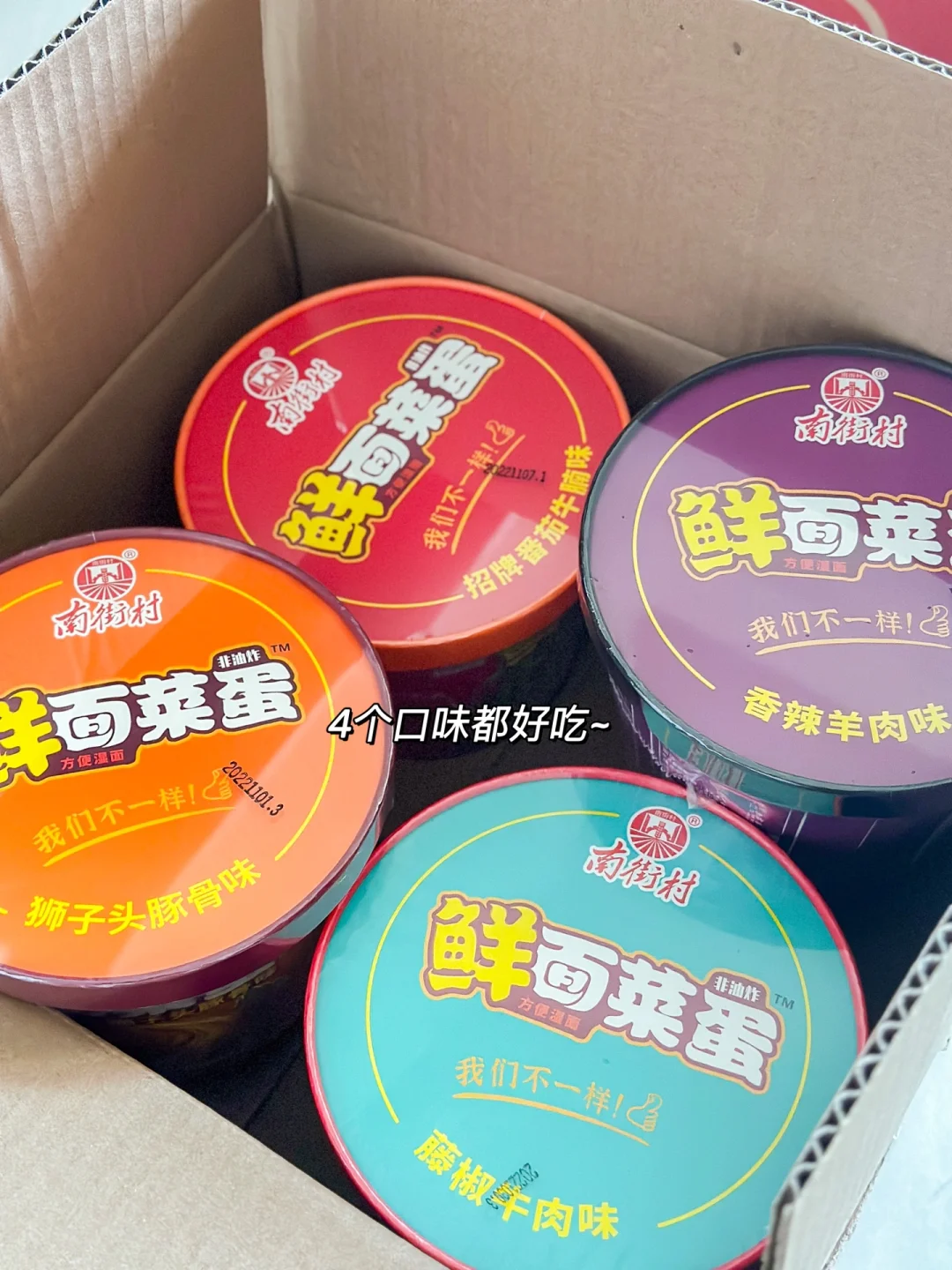 有粉又有面🍜就喜欢这两全其美的感觉~ 爱吃面又爱嗦粉的千万不能错过这个! 南街村的鲜面菜蛋!!粉面结合真的绝了555! 而且面还是非油炸的那种湿面饼! 还配了个卤蛋~泡个几分钟就完事儿了! 四个口味:香辣羊肉味 狮子头豚骨味 藤椒牛肉味还有番茄牛腩味 藤椒牛肉和狮子头豚骨配的是狮子头哦 其他配的是卤蛋~ 每一款都好吃😋简直就是夜宵首选嘛! 分量妥妥的!味道鲜美!比泡面更好吃又健康!