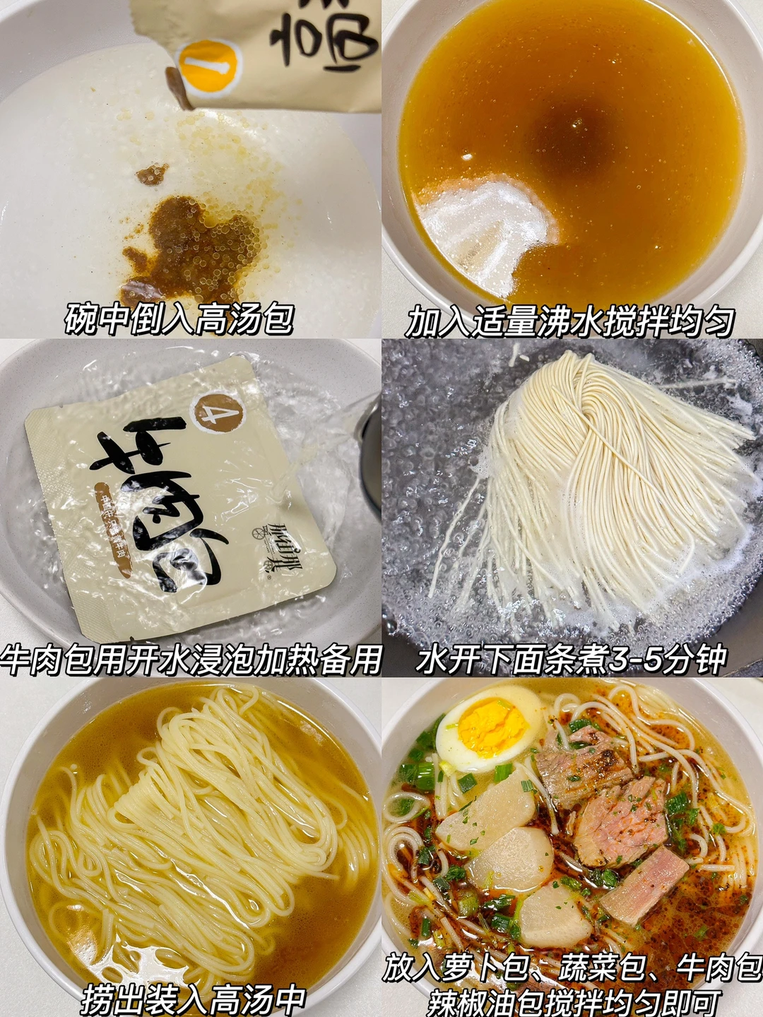 3️⃣放入萝卜包、蔬菜包、牛肉包和辣椒油包搅拌均匀即可