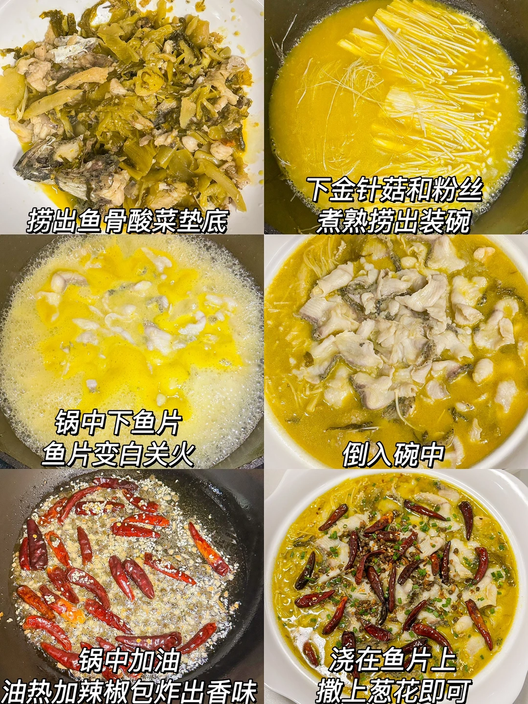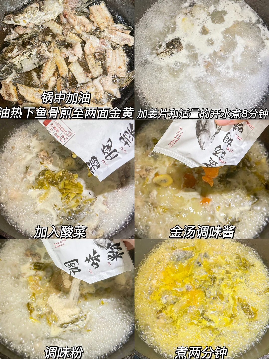 3️⃣加入酸菜,金汤调味酱,调味粉搅拌均匀,煮两分钟捞出鱼骨酸菜垫底,下金针菇和粉丝煮熟捞出装碗
