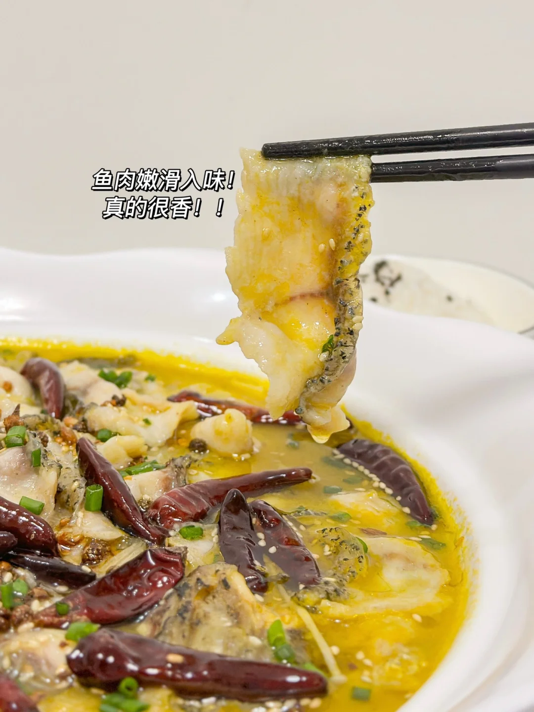 5️⃣锅中加油,油热加辣椒包炸出香味浇在鱼片上,撒上葱花即可开吃
