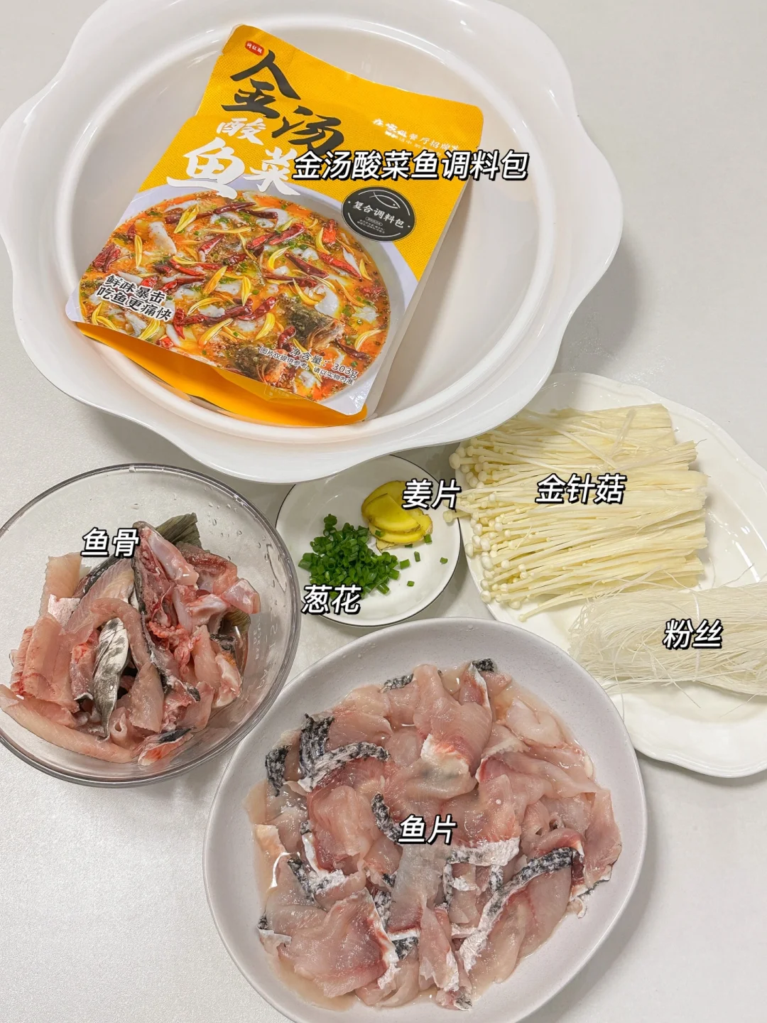 黑鱼一条 金针菇适量 粉丝一捆 金汤酸菜鱼调料包一包 姜片 葱花