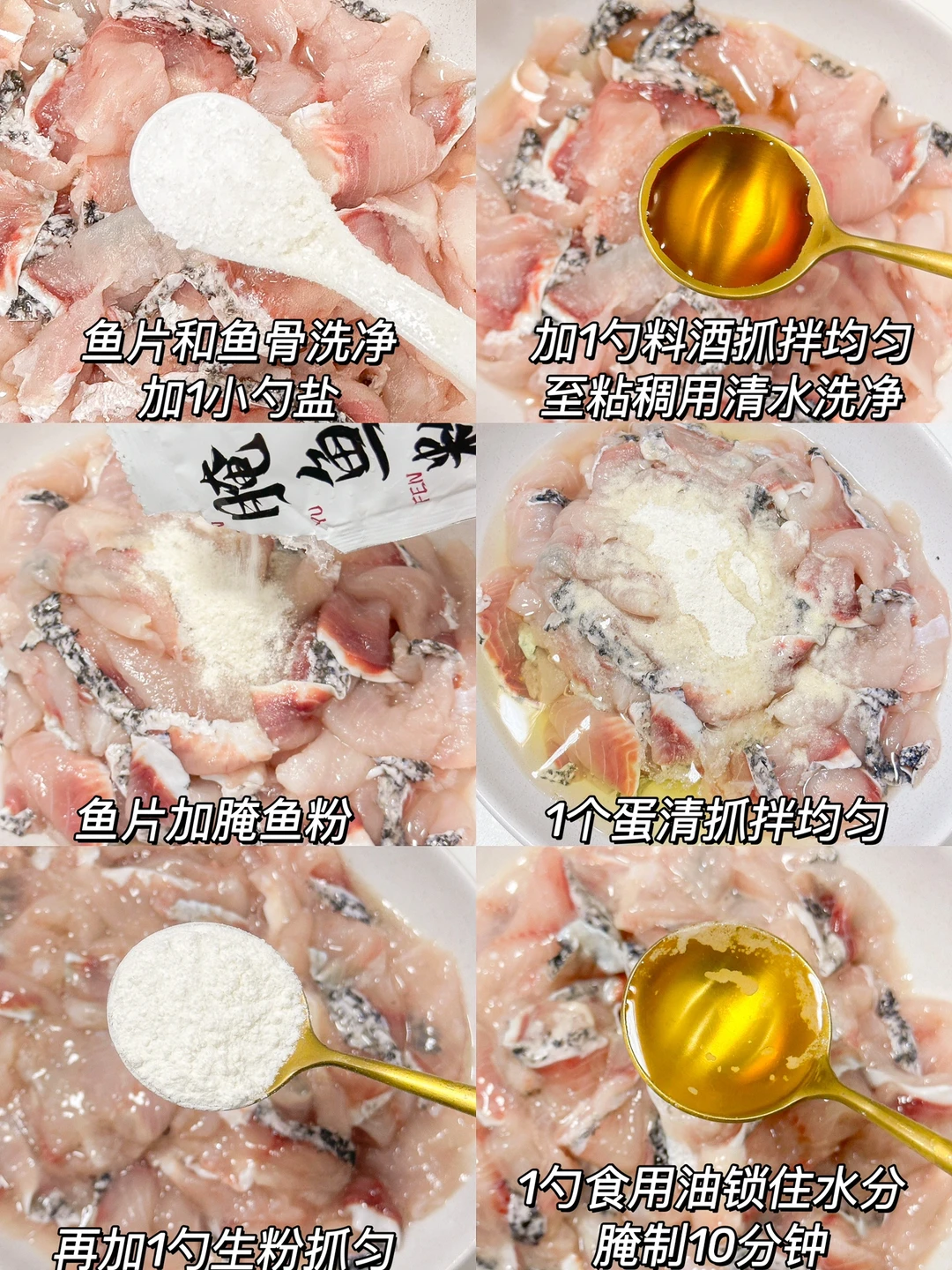 1️⃣鱼片和鱼骨洗净➕1小勺盐➕1勺料酒抓拌均匀至粘稠用清水洗净,鱼片加腌鱼粉➕1个蛋清抓拌均匀➕1勺生粉抓拌均匀再➕1勺食用油锁住水分腌制10分钟
