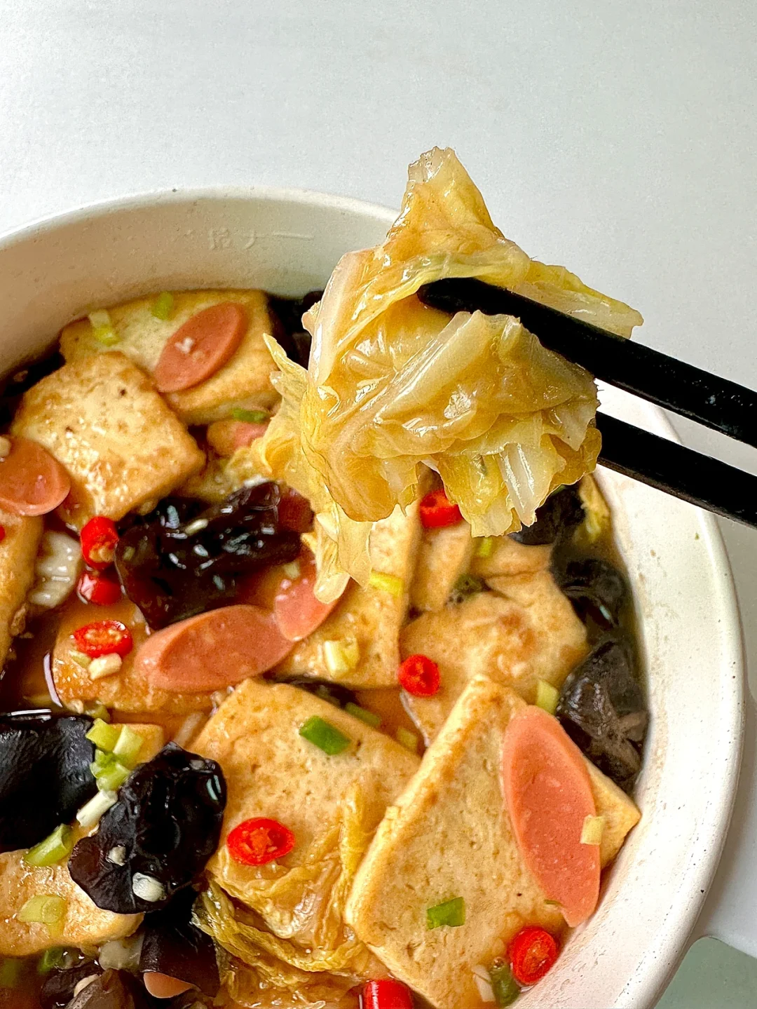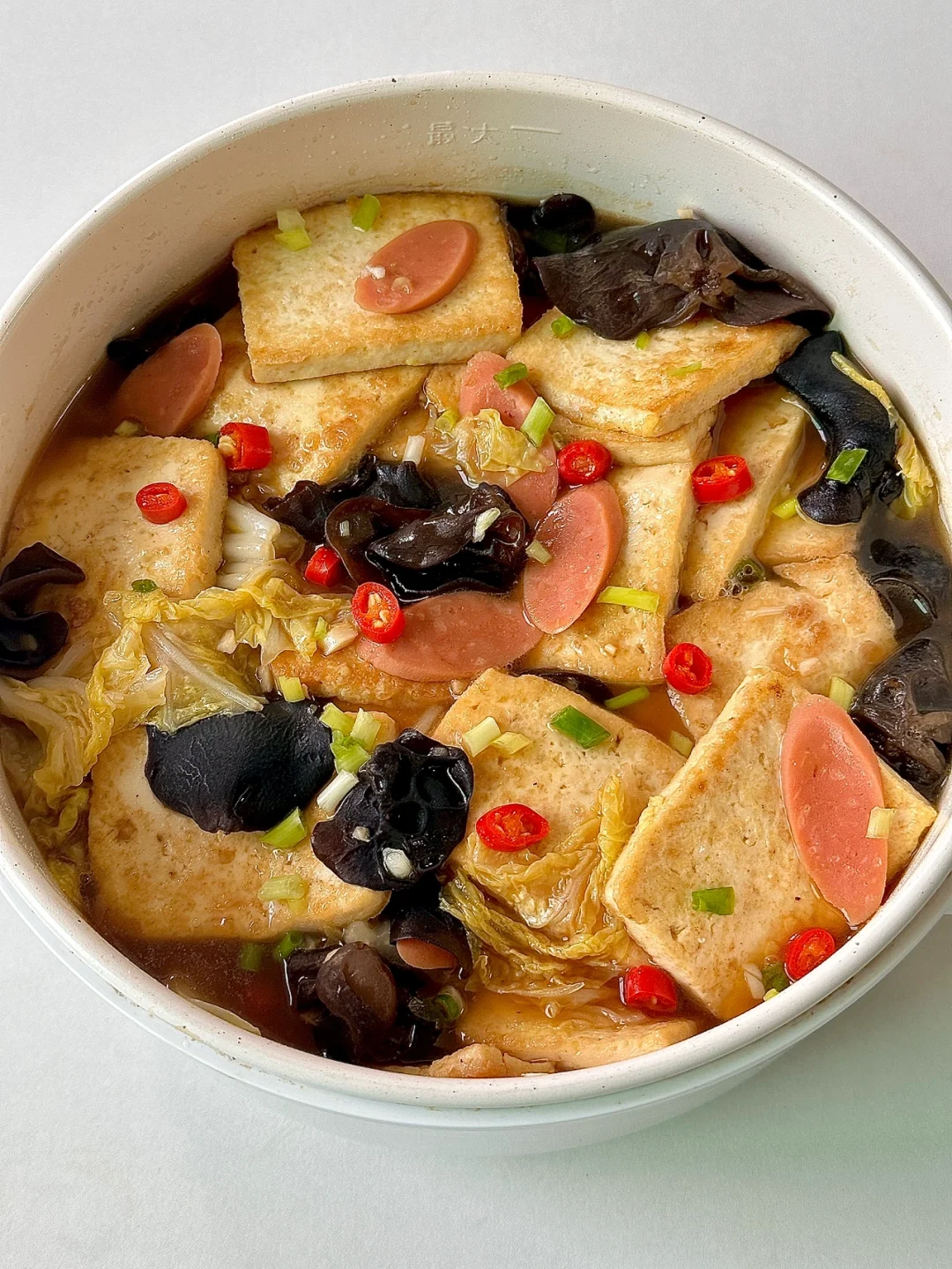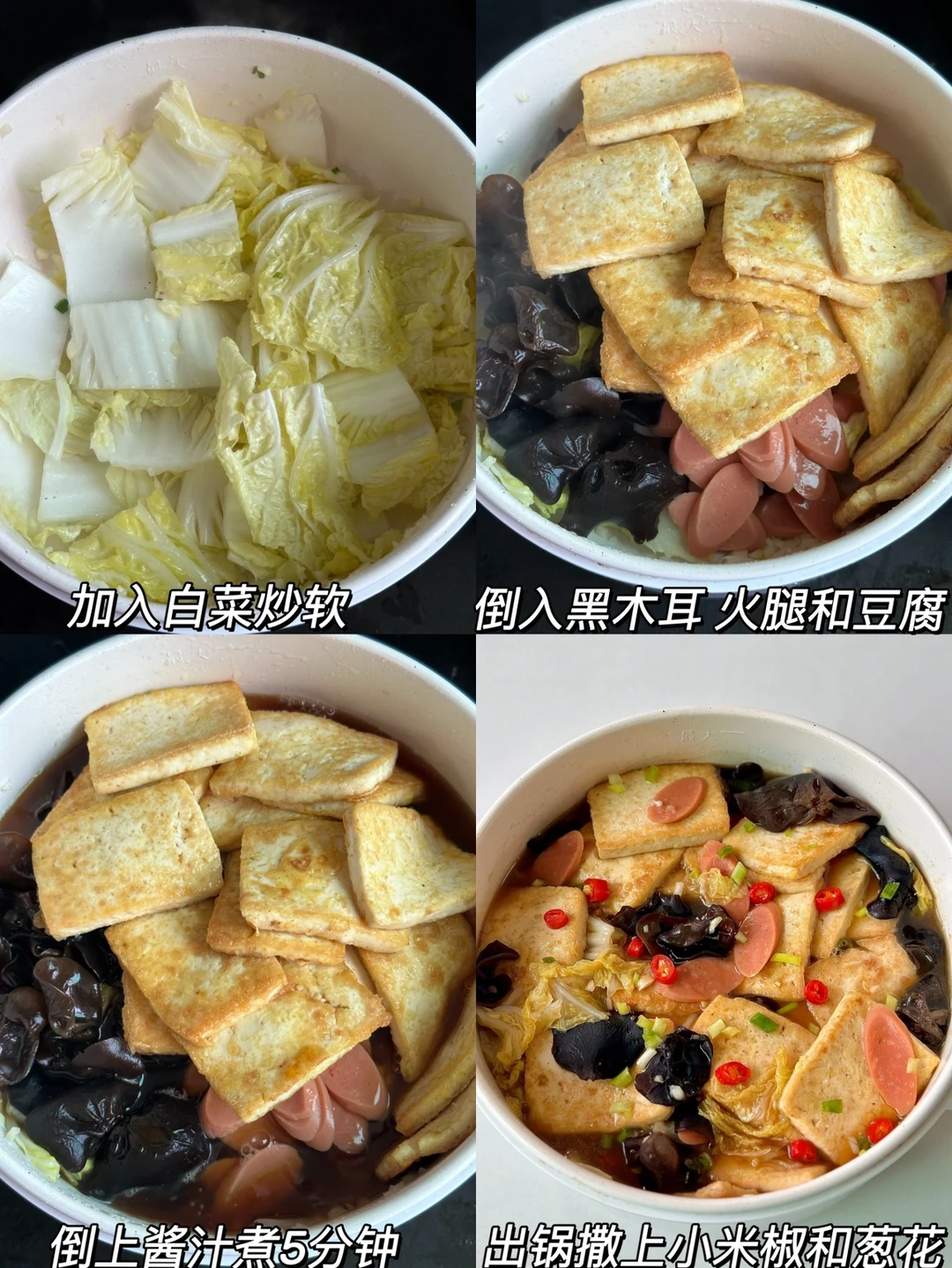 4⃣少油爆香葱蒜,加入白菜炒软,倒入黑木耳 火腿和豆腐,倒上酱汁煮5分钟,出锅撒上小米椒和葱花即可