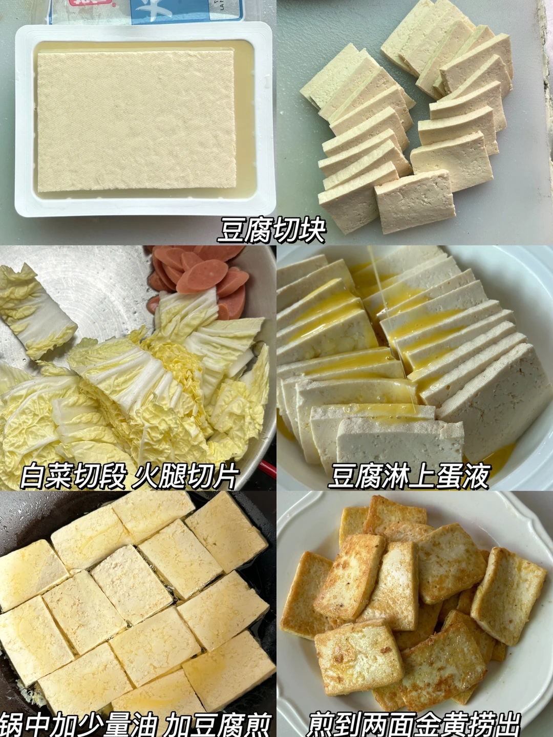 2⃣豆腐淋上蛋液,锅中加少量油,加豆腐煎至两面金黄捞出