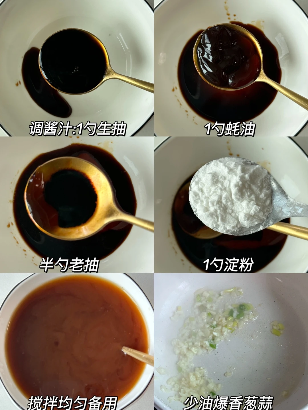 3⃣调酱汁:1勺生抽➕1勺蚝油➕半勺老抽➕1勺淀粉➕1碗清水搅拌均匀备用