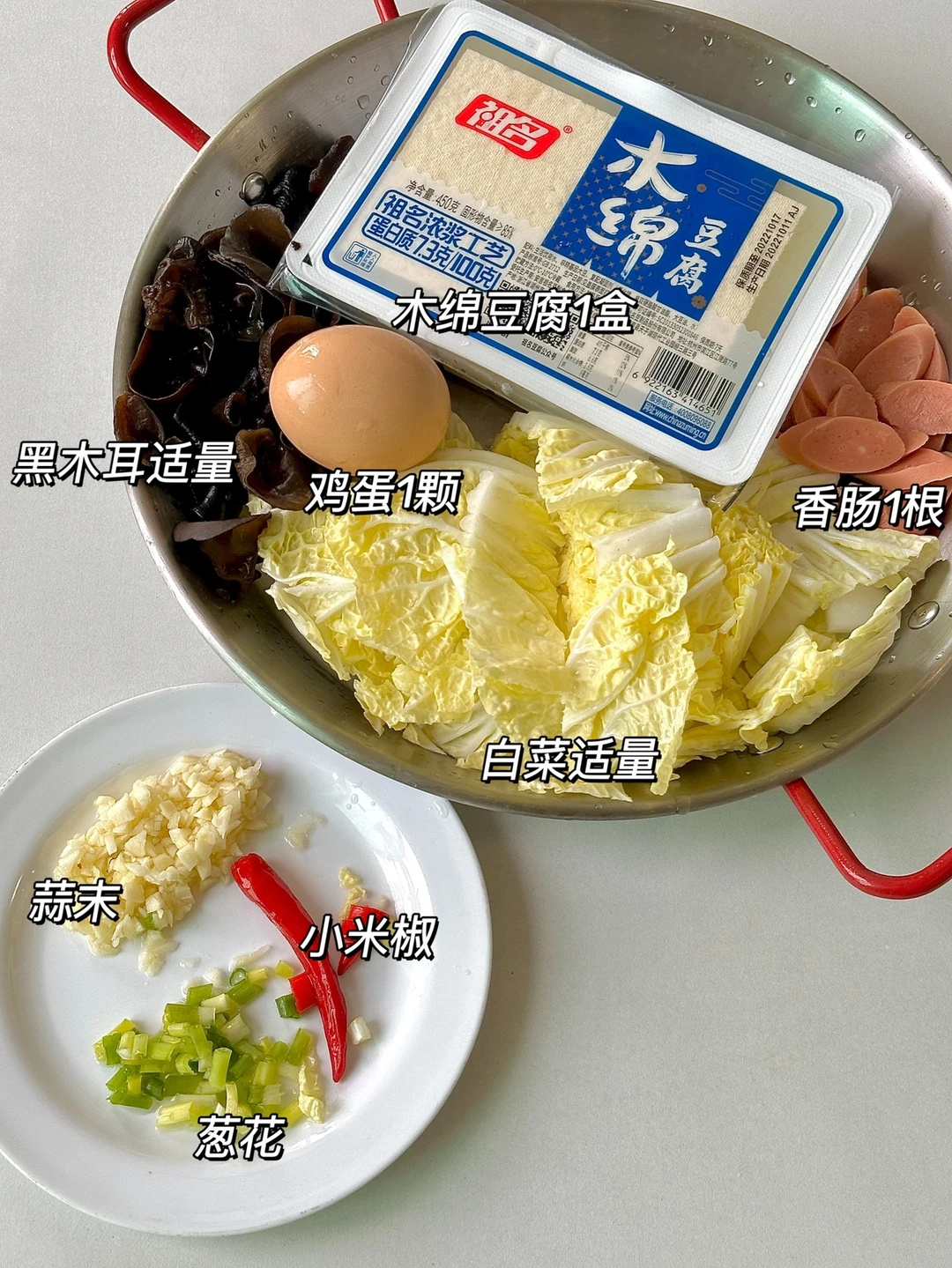 白菜适量 祖名木绵豆腐一盒 火腿一根 黑木耳适量 鸡蛋一颗 葱 蒜沫 小米椒