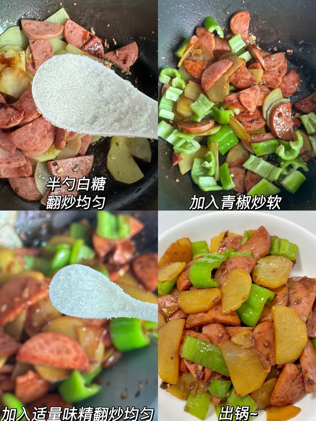 3️⃣加入青椒炒软,加入适量味精翻炒均匀即可出锅