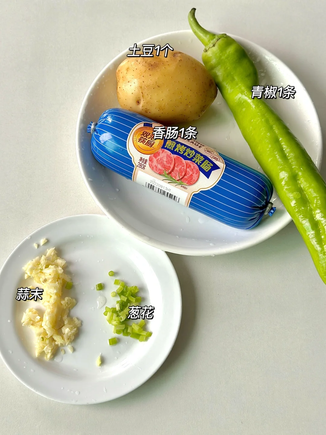 青椒1条 香肠1条 土豆1个 大蒜 葱
