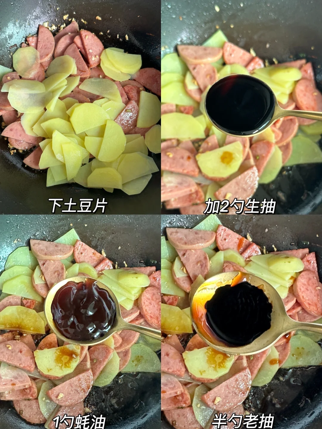 2️⃣锅中加油,油热放葱蒜爆香,倒入火腿片煎变色,下土豆片,➕2勺生抽➕1勺蚝油➕半勺老抽➕半勺糖翻炒均匀