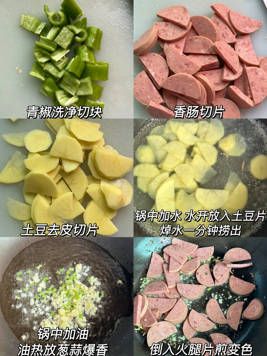 1️⃣青椒洗净切块,火腿肠切片,土豆去皮切片,锅中加水,水开放入土豆片焯水一分钟捞出