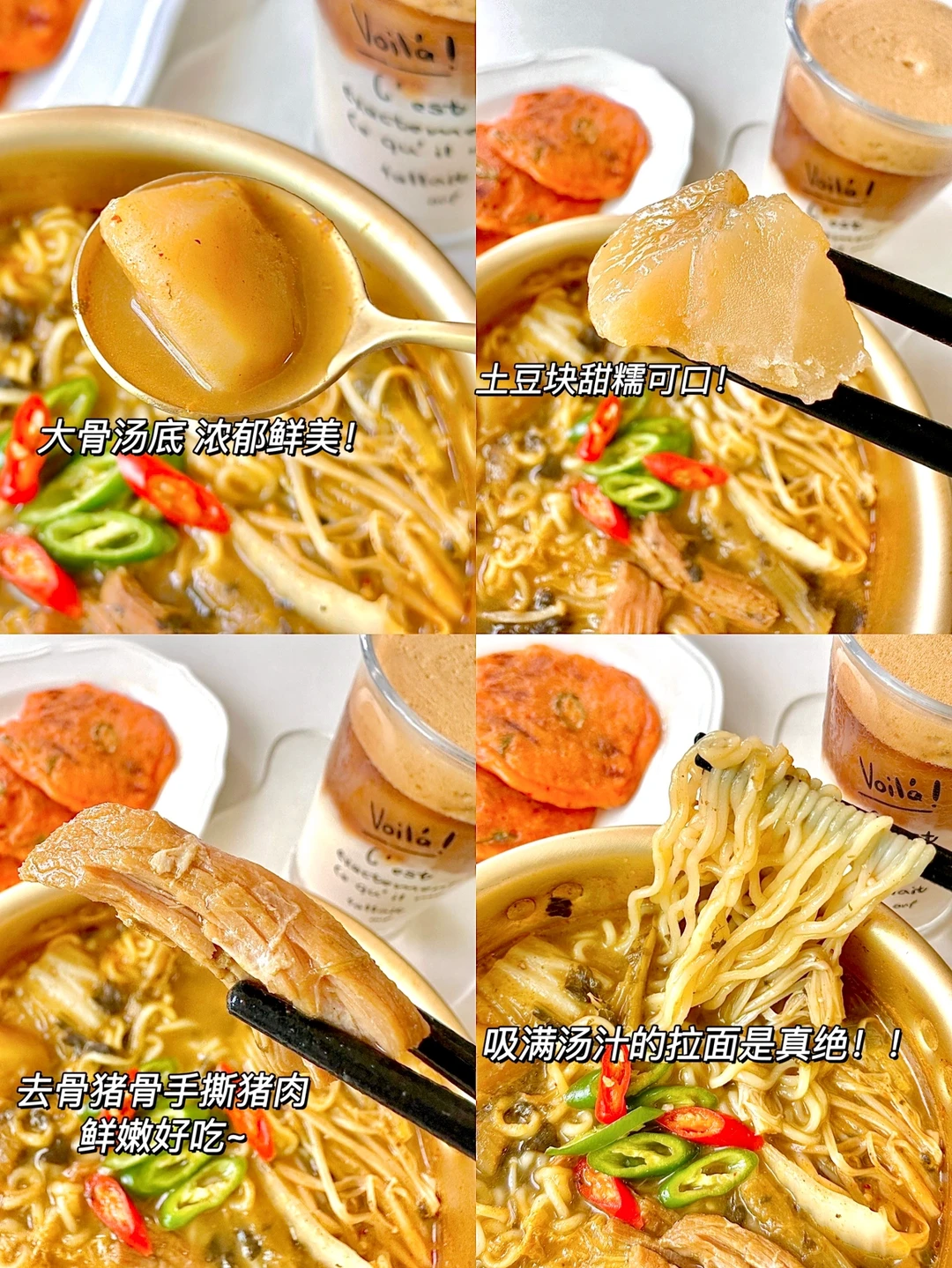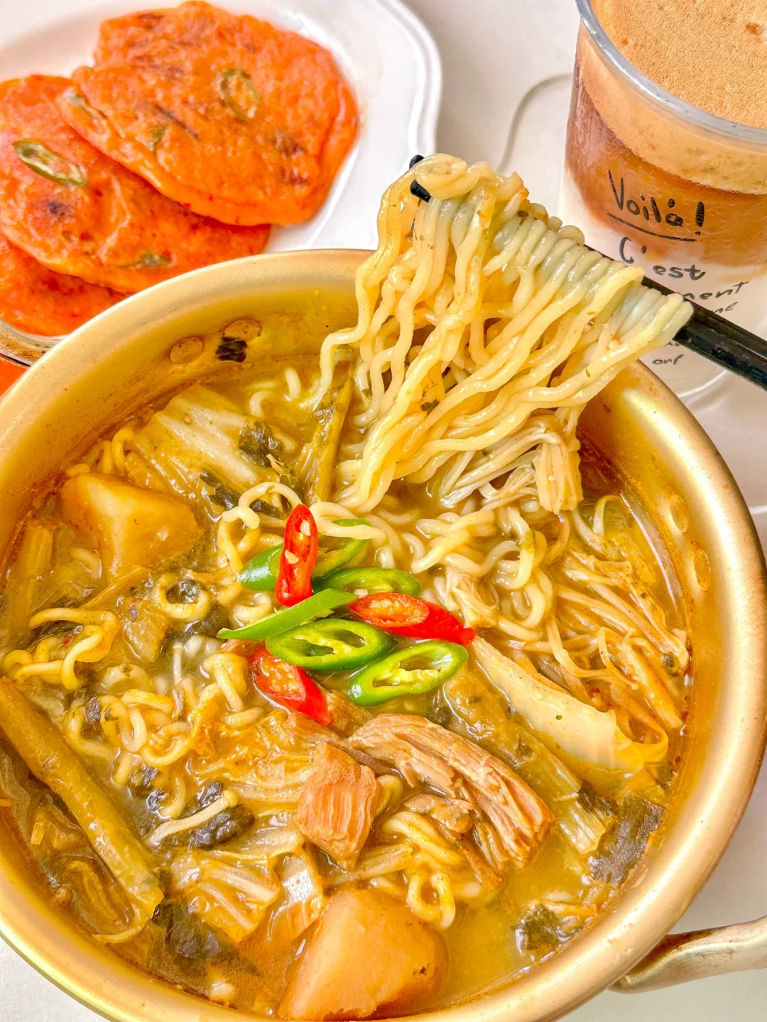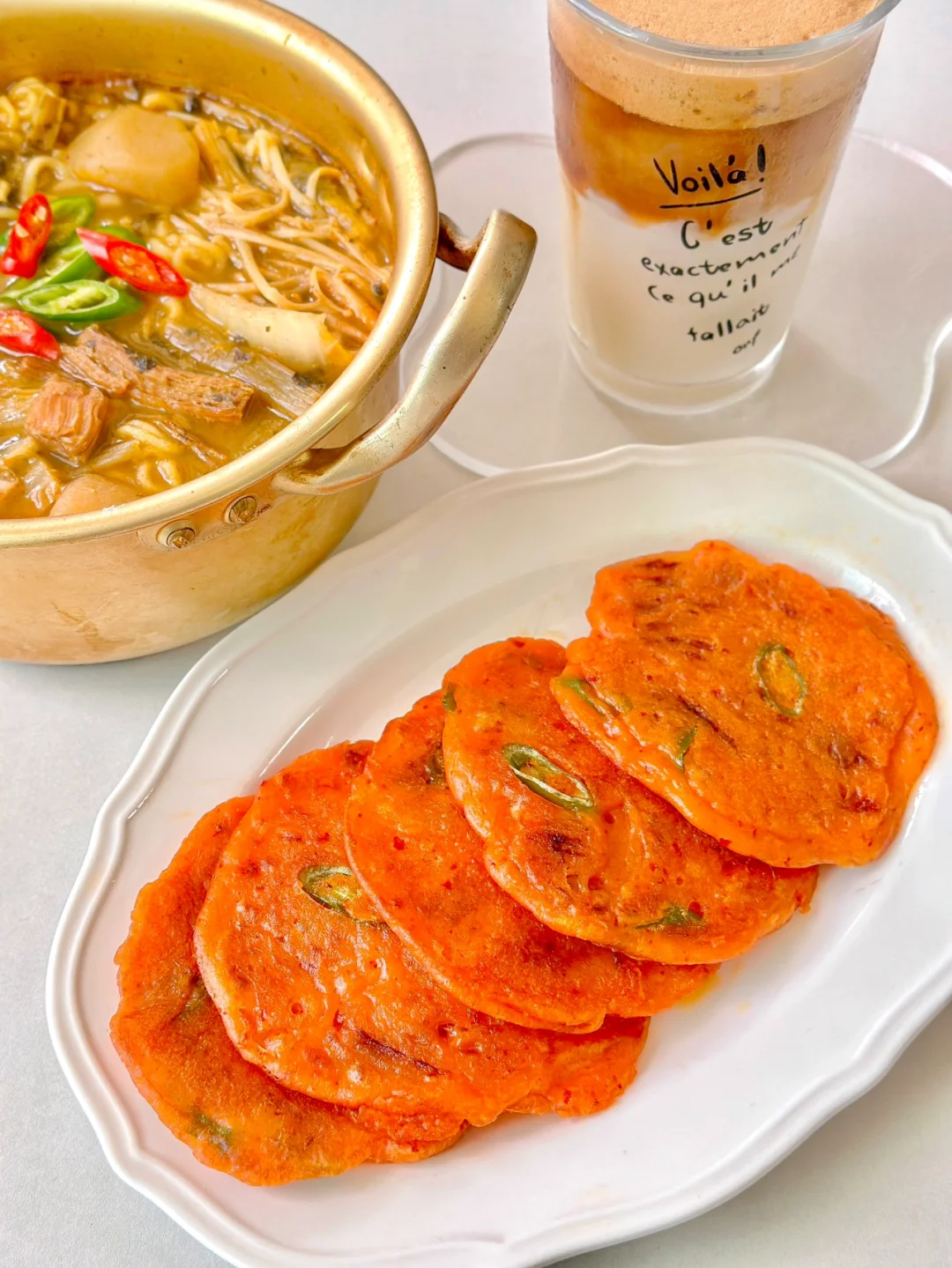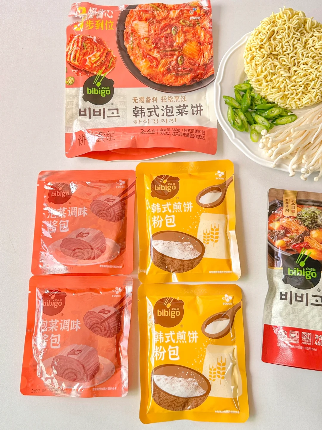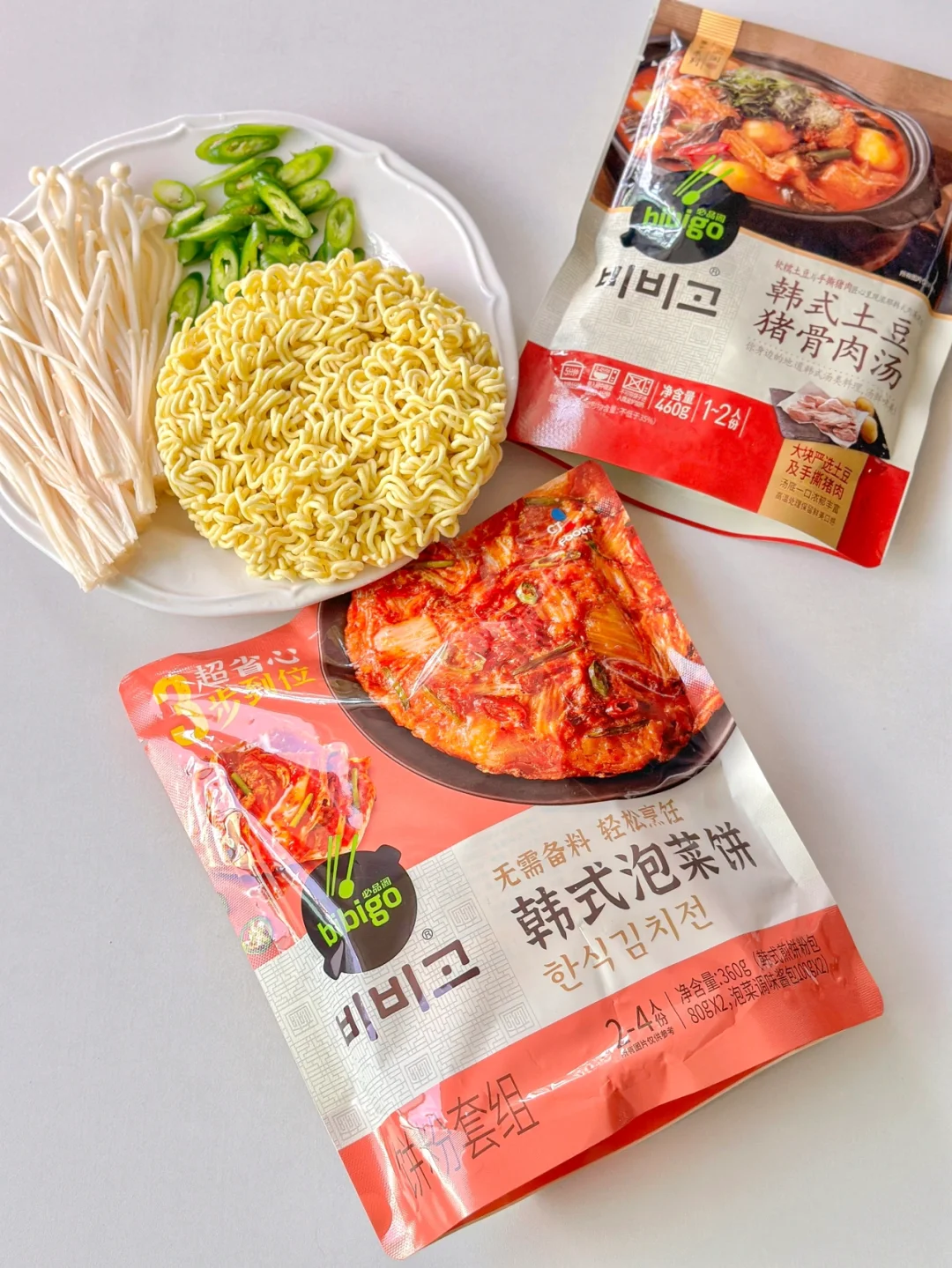 每次追韩剧都要被里面的韩式料理诱惑到,越看越饿,在家又吃不了只能去店里吃,这两天逛超市囤了必品阁的韩式泡菜饼和韩式土豆猪骨汤,分享给大家 做法也简单的哦😘 . 🌟韩式泡菜饼🌟 已经配好了煎饼粉和泡菜调味酱包,一袋里面2套,独立包装一次做一套~吃起来和餐厅里的一样,煎好外脆里嫩,有嚼劲! 🔸做法🔸 1️⃣碗中加1包饼粉再加入120ml水混合均匀后加入1包泡菜酱包搅拌均匀备用(也可以再加点自己喜欢的食材,我还加了点青椒) 2️⃣平底锅加油中火预热,倒入混合好的面糊,煎至两面金黄 3️⃣装盘即可开吃啦 . 🌟韩式土豆猪骨肉汤🌟 浓郁去骨的猪骨汤底搭配甜糯可口的土豆 猪肉鲜嫩~煮好的汤热乎乎的 很鲜美!再加点自己喜欢吃的配菜和拉面,吃完整个人都暖乎乎的! 🔸做法🔸 1️⃣锅中倒入汤包,倒入适量水煮沸 2️⃣加入喜欢的配菜 拉面煮5分钟出锅 放点青红椒点缀即可 厨房小白也可以轻松做起来啦!我对象说味道可以媲美餐厅了!想吃自己做!爱吃韩式料理的姐妹们快冲~