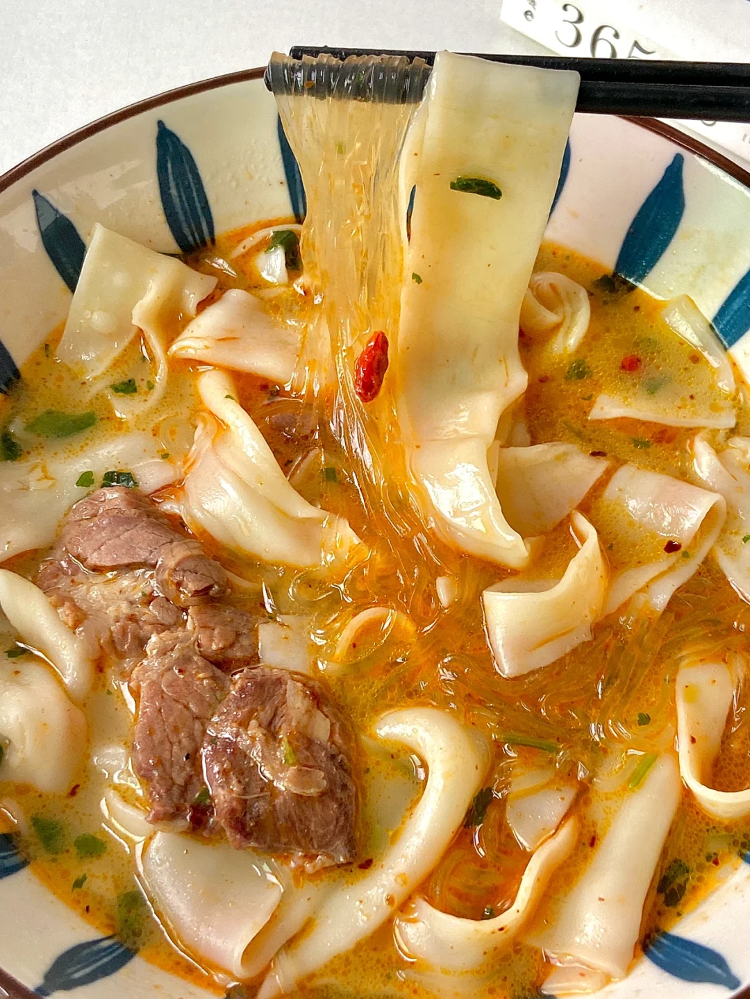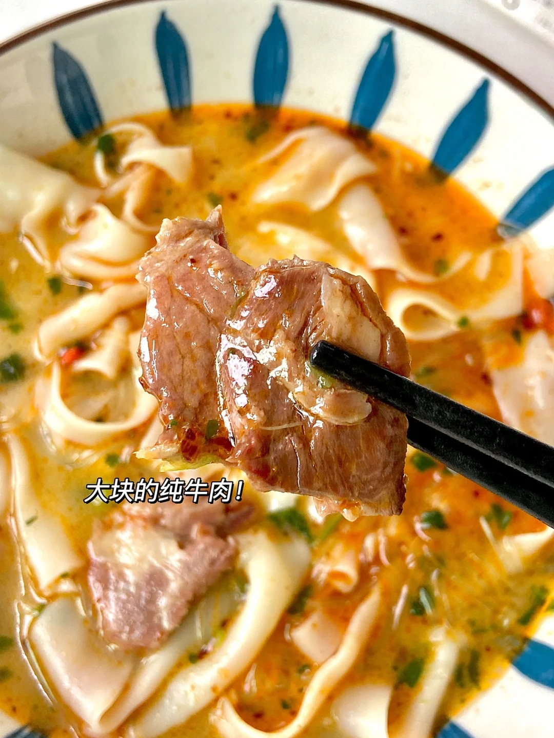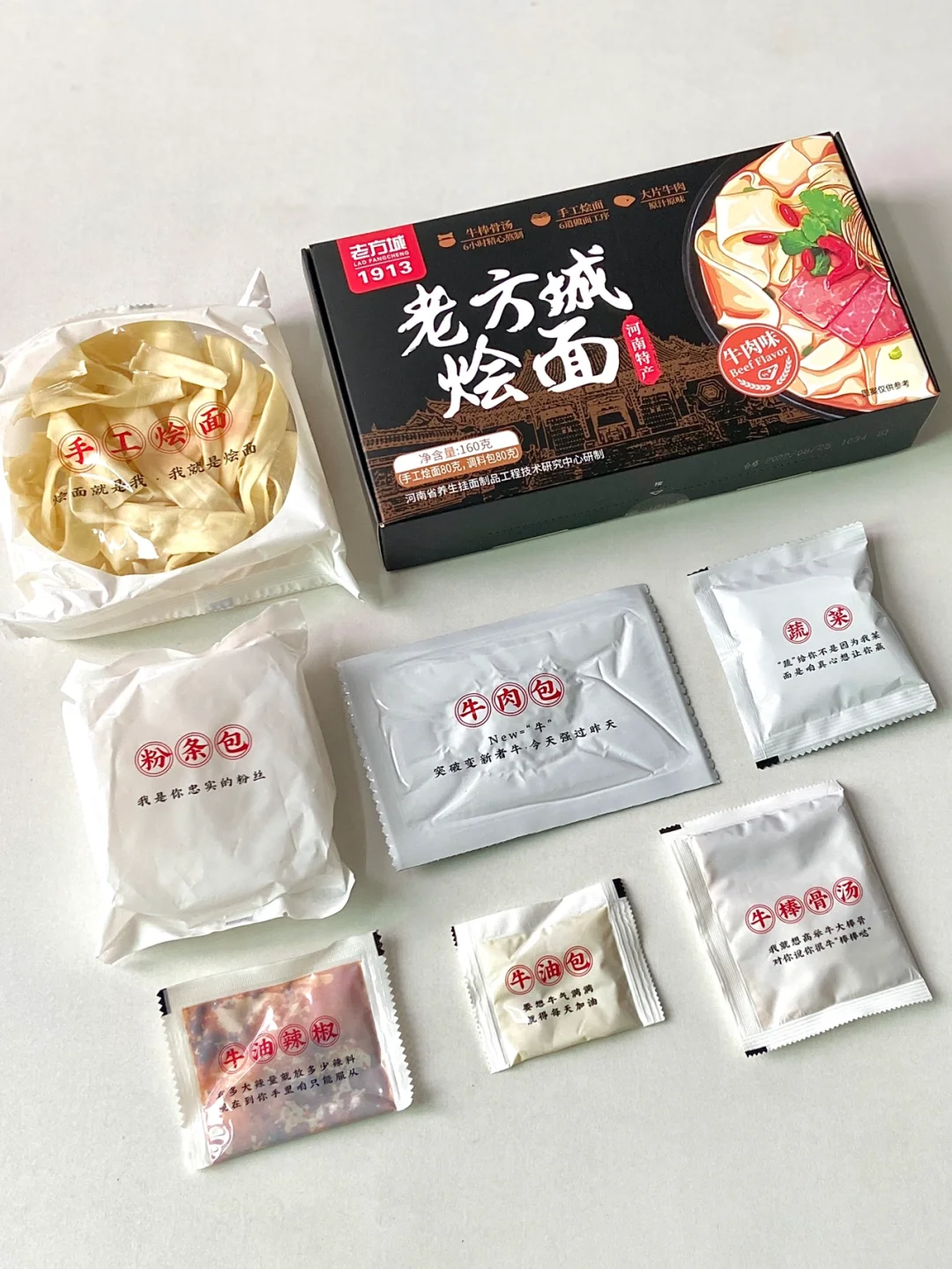 自从上次吃了河南室友推荐的老方城羊肉烩面!真的香哭了!吃了还想吃!于是赶紧又入手了牛肉烩面!🥩 . 还是十分钟就出锅!还是宽宽的劲道爽滑的面条!但这个多了粉条!一下子拥有了粉+面的双重快乐!配料包里自带大块纯牛肉、蔬菜包、牛油包和牛油辣椒! . 牛骨➕牛油的汤头!浓郁鲜香!吸满牛油辣椒汤汁的宽面粉条口感好丰富!鲜到掉毛!不仅面好吃汤也好喝!一口面一口汤真的好解馋~ . 宅家实现烩面自由!大块的牛肉吃得又过瘾!而且又方便!上班族、宿舍党和宵夜党们可以囤点儿!比外卖健康好吃多了~