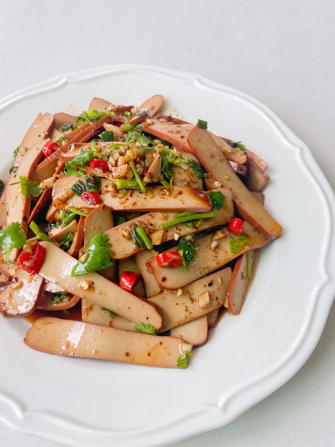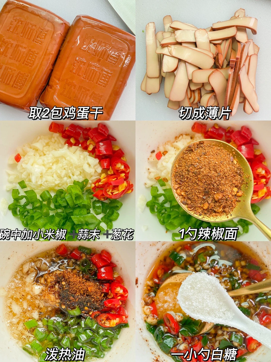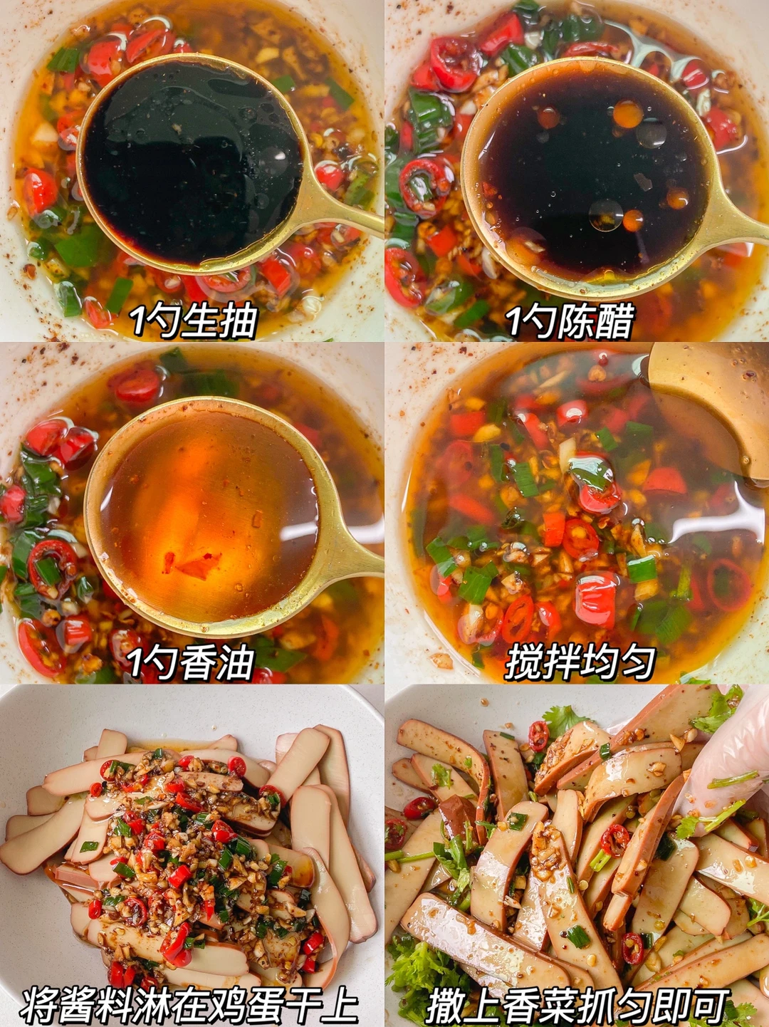 天气越来越热 吃热菜越吃越热 吃饭都没胃口🙃坠近一直在安排凉菜 前两天做了腌萝卜 拍黄瓜 腌海带 今天来做一道凉拌鸡蛋干 滑嫩爽口~ 准备食材✨✨✨✨✨ 鸡蛋干2包 小米辣2条 蒜末 葱花 香菜 做法✨✨✨✨✨ 1️⃣取2包鸡蛋干切成薄片 2️⃣碗中加入小米椒➕蒜末➕葱花 ➕1勺辣椒面泼热油➕一小勺白糖➕1勺生抽➕1勺陈醋➕1勺香油拌匀 3️⃣将酱料淋在鸡蛋干上 撒上香菜拌匀即可 一道下饭又开胃的凉拌鸡蛋干就做好啦~✅ 真的巨好吃!!!家里有鸡蛋干的可以试试😊