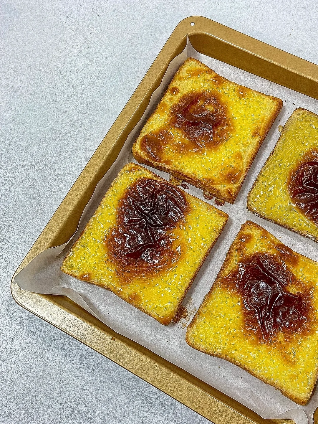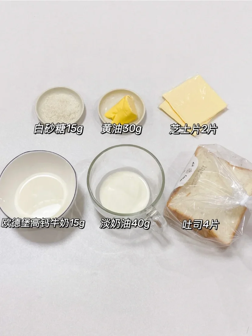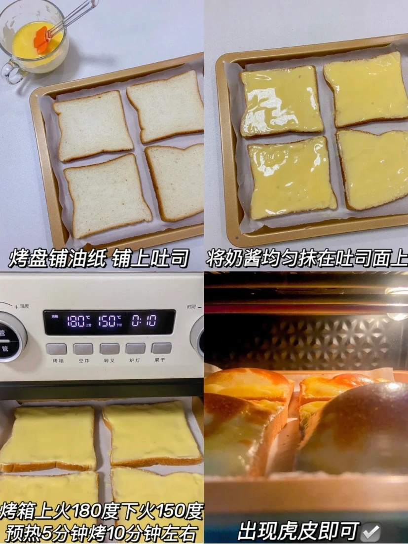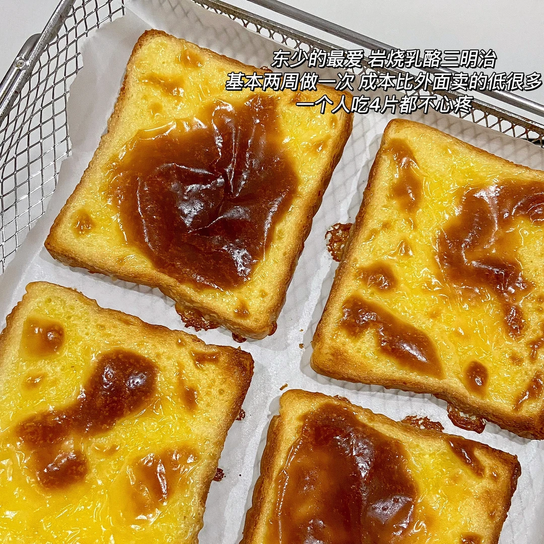 [爆炸R]学会了再也不用出去买了,复刻店里同款岩烧乳酪吐司,做了好多次了,这个做法是大家公认说好吃的~如今店里买一片都要9块左右了[汗颜R]在家里做成本低,吃多了都不心疼![偷笑R]刚出炉热腾腾的比店里都好吃!再次分享给大家[赞R][赞R][赞R] . 🌟准备食材🌟 吐司4片 黄油30g 白砂糖15g 芝士片2片 牛奶15毫升 淡奶油40毫升 🌟做法🌟 1️⃣不粘锅加入30g黄油➕15g白糖➕2片芝士片,开小火搅拌至融化 2️⃣锅中再加入15ml牛奶和40毫升淡奶油,小火搅拌至稍微有点粘稠倒出放凉 3️⃣烤盘垫油纸,摆上吐司,将做好的奶酱均匀抹在每一片吐司上 4️⃣烤箱上火180度下火150度预热5分钟 中层烤10分钟左右即可 ⚠️每个烤箱脾气不一样,烤五分钟左右就要经常观察以免烤焦,表层出现虎皮即可! 空气炸锅也可以做哦 时间8-10分钟左右 . 做法真的狠简单,0失败的!!厨房小白轻松get![斜眼R]这个味道真的跟店里买的是一模一样的,中国人不骗中国人,学会了谁还出去买啊!一片的价格自己在家都可以做四五片了![失望R]每天早上来两片可好吃了,我一家人都喜欢吃,一早上得烤两盘的那种[笑哭R] . 喜欢吃岩烧乳酪三明治的姐妹们快去试试叭!!会开启你的新大陆的🤗🤗🤗