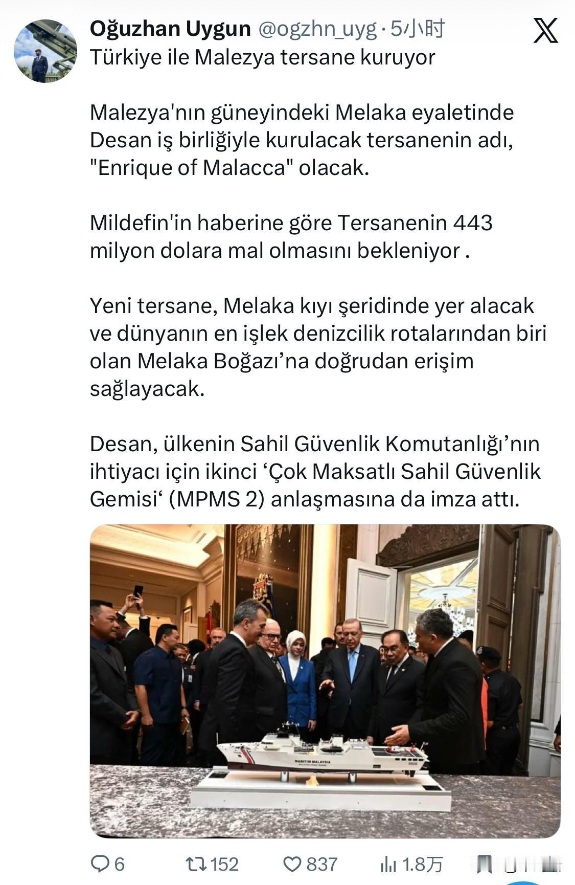 土耳其和马来西亚正在合作建立一家造船厂。 该造船厂将与 Desan 公司合作,在马来西亚南部马六甲州建造,并将被命名为“马六甲的恩里克号”。 据 Mildefin 称,该造船厂预计耗资 4.43 亿美元。 新造船厂将位于马六甲海岸线上,并可直接通往马六甲海峡,这是世界上最繁忙的海上航线之一。 Desan 还签署了第二份合同,建造一艘“多用途海岸警卫队舰艇”(MPMS 2),以满足该国海岸警卫队司令部的需求。 土耳其的 Desan Shipyard(Desan 造船厂),全称为 Desan Deniz İnşaat Sanayi A.Ş.。 2025 年 7 月,Desan 已为马来西亚海岸警卫队的第一艘多用途任务舰(MPMS)举行了首开钢板仪式。预计该舰将于 2026 年中旬 下水,2027 年交付。 2026 年 1 月,Desan 与马来西亚马六甲州政府敲定了价值 18 亿令吉(约合 4.1 亿美元)的现代造船厂开发合作,旨在马六甲海峡打造区域性的造船与维修基地。