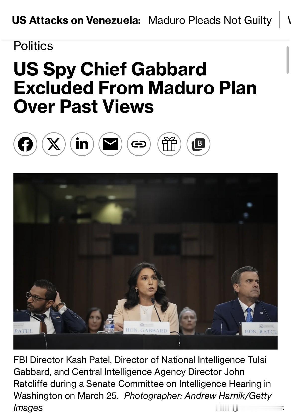 彭博社(BLOOMBERG)最新报道:白宫将国家情报局(CIA)局长图西·加巴德/Tulsi Gabbard从针对委内瑞拉军事行动方案的几个月的规划会议中排除出去。 极大可能是因为她之前一直反对在委内瑞拉采取军事行动。