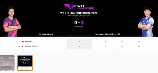 WTT多哈冠军赛,向鹏0-3不敌张本智和,止步男单首轮,比分为4-11、7-11、8-11。男单第二轮,周启豪将对阵张本智和。