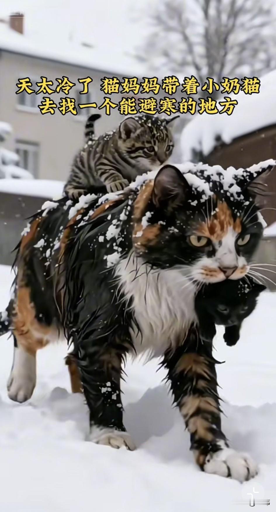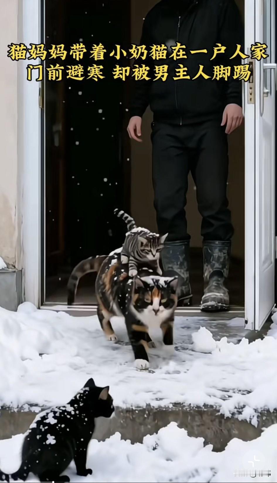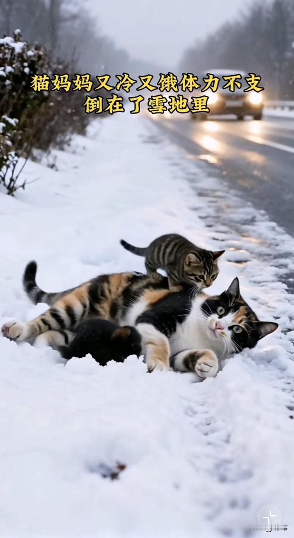 泪目了!因为暴风雪肆虐,天气太冷了!一只猫妈妈只好带着两只小奶猫去找一个避寒的地方,它背上背着一只小奶猫,嘴里又叼着一只,吃力的走在雪地里,它好不容易找到一户人家,却被男主人一脚踢开。 猫妈妈只好又带着孩子们去找地方避寒,结果又累又饿的它,因为体力不支昏倒在了马路旁边。两只小奶猫非常担心妈妈的安危,于是只好分头去找人救助妈妈,幸运的是小黑猫遇到了一位善良的阿姨,她跟着小黑猫找到了猫妈妈和另一只小奶猫,好心的阿姨把它们一家三口抱上了车,然后收养了它们,从此它们有了一个温暖的家和一个爱它们的主人。