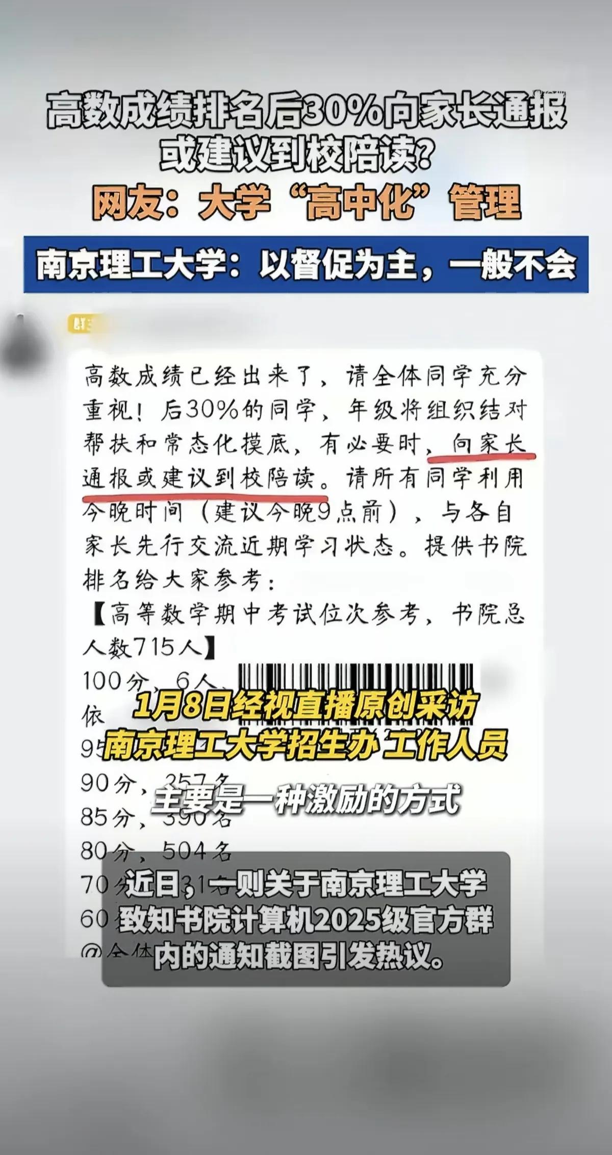 大学发成绩单让家长陪读:教育该“放手”还是“紧盯”? 近日,南京理工大学通知“高数成绩后30%或通报家长并建议陪读”引发热议。校方回应此为激励和督促手段,一般不会轻易实施陪读。但争议背后,是大学教育管理方式的深层思考。 支持者认为,严格的学业预警能有效防止学生松懈,尤其对自制力较弱的新生。但反对声音指出,大学生已是成年人,学校过度介入无异于“高中化”管理,可能削弱学生的自主责任意识。 大学教育不仅是知识传递,更是人格独立与自我管理的培养过程。适度关注学业有必要,但方法应重在引导而非替代。简单的成绩通报若缺乏个性化辅导,可能徒增焦虑,甚至引发学生逆反心理。 教育需要在“放手”与“紧盯”间找到平衡点。与其让家长“远程陪读”,不如强化校内导师制、朋辈帮扶等支持体系,帮助学生真正学会为自己的学习负责。毕竟,教育的最终目的,是培养能独立行走的人,而非永远需要搀扶的孩子。