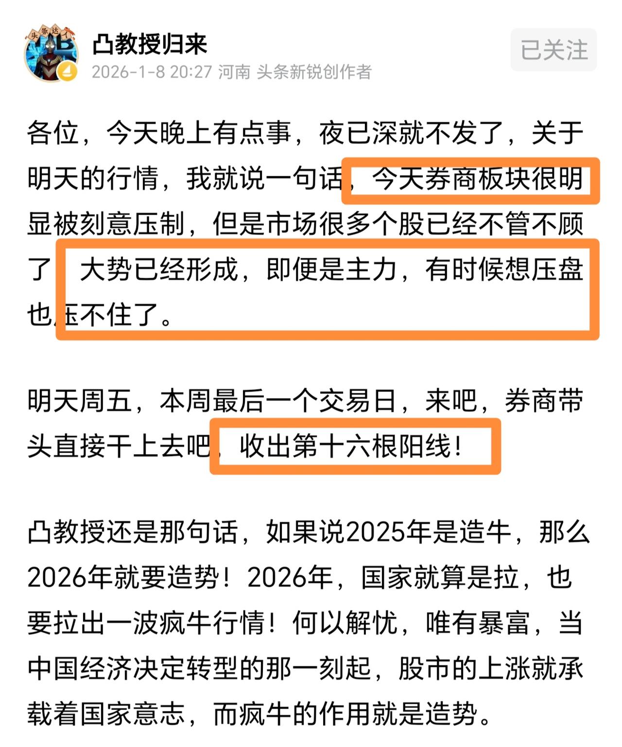 压盘压不住了!凸教授深夜发文,券商很明显被压制了,但是其他个股都涨上去了,上涨趋势一旦形成,主力也休想把盘面控制。周五一定会收阳线,一举拿下16连阳。在凸教授眼里,好像天天都是阳线,不管股市涨还是跌,凸教授眼里都是上涨,确实是个奇人!