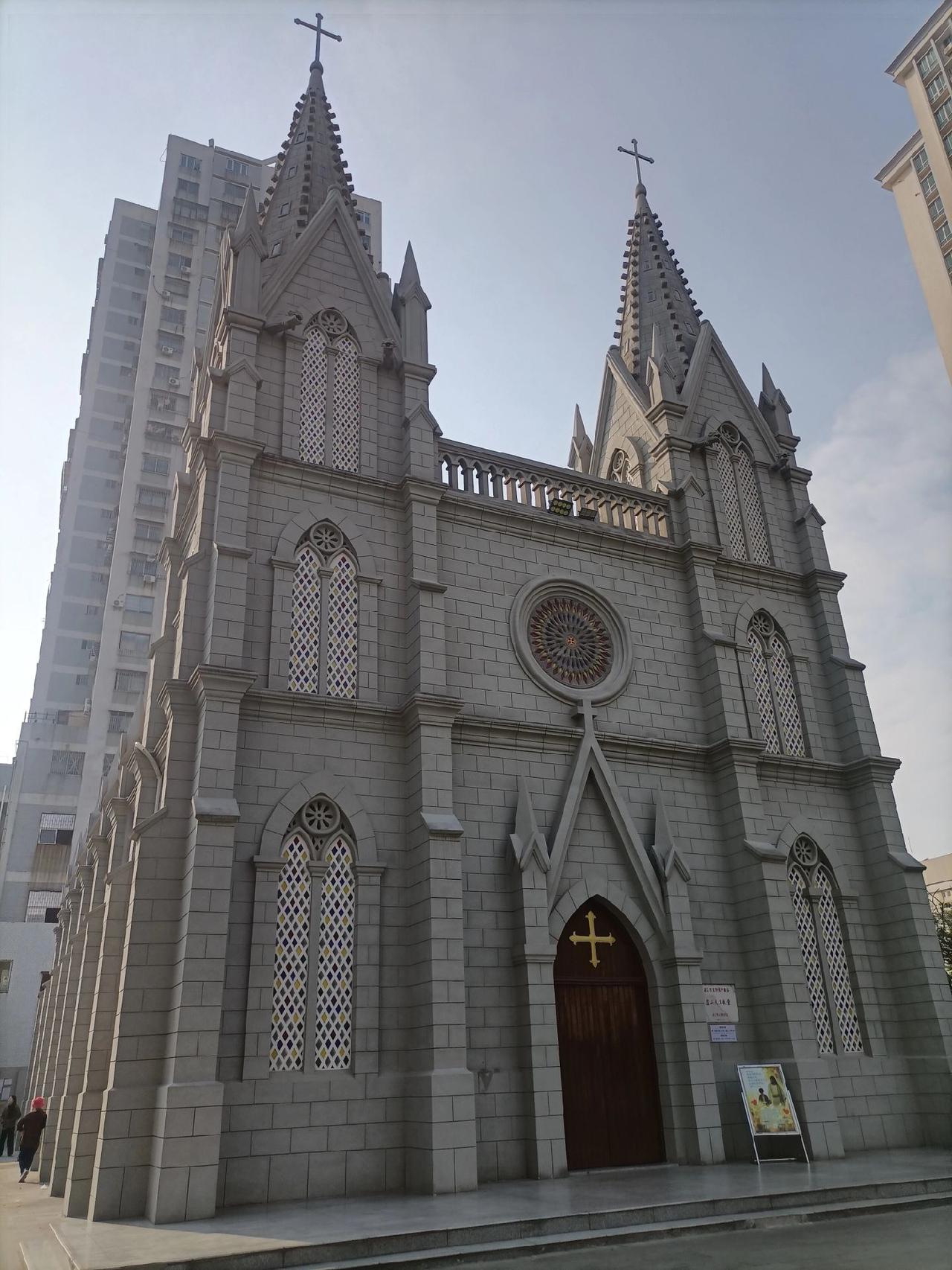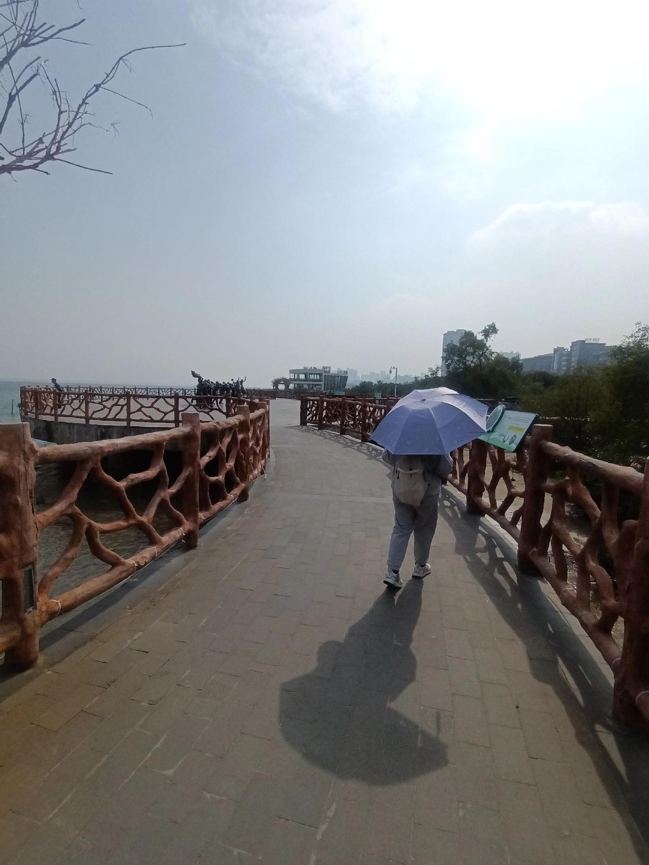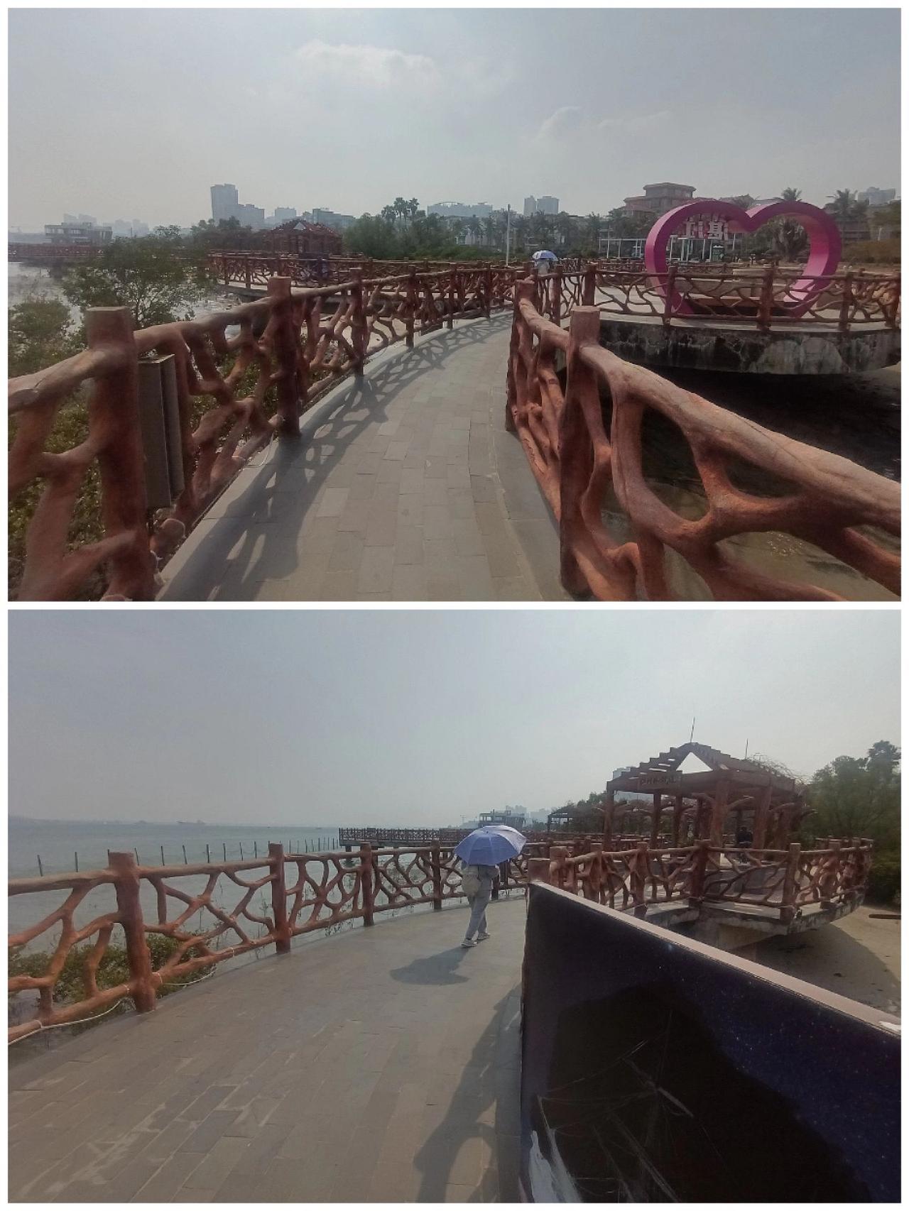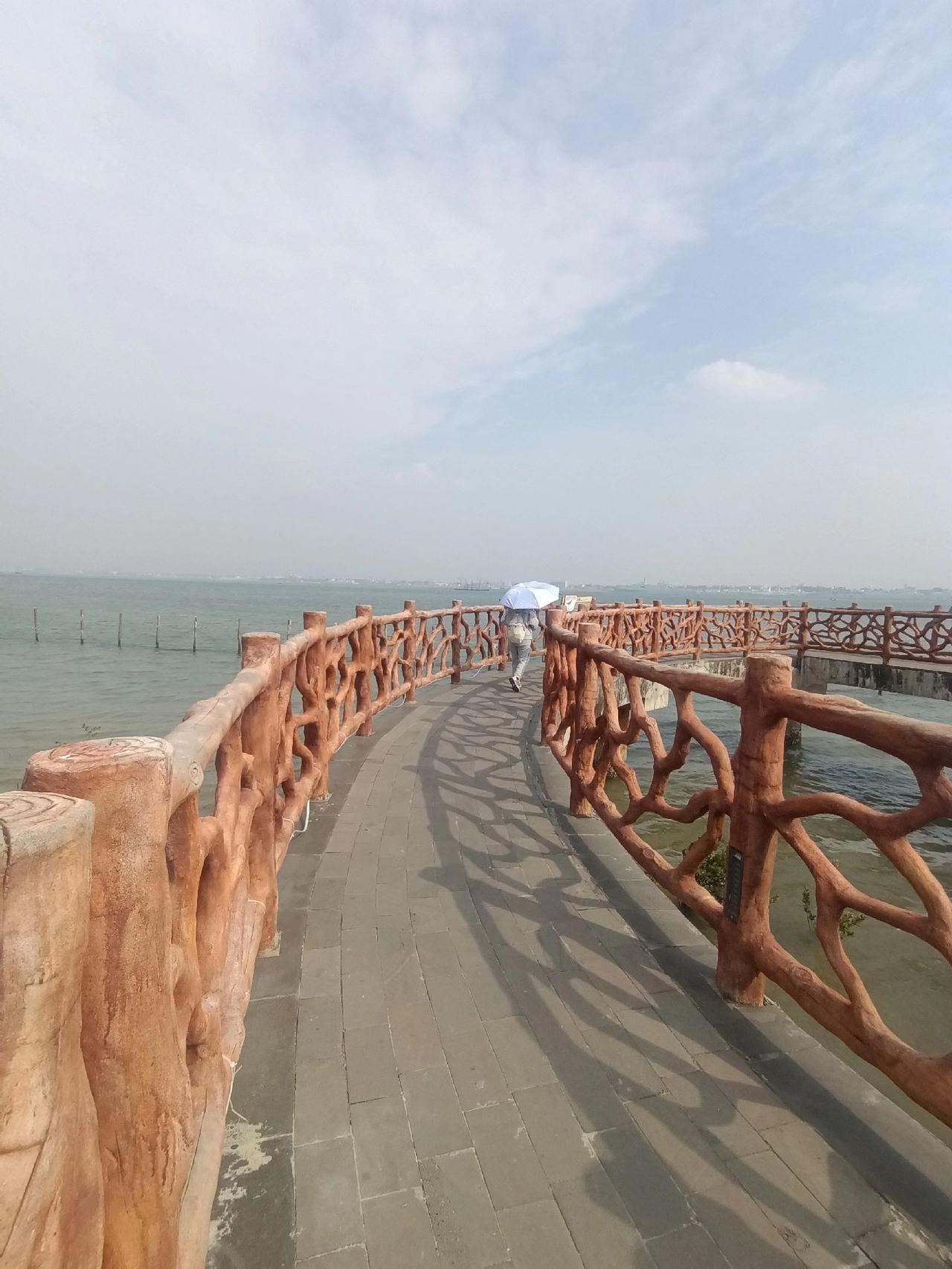 去霞山观海长廊开始很沮丧,因为正在围墙内大修进不去,无奈右转随便逛海边,却发现不知名的海上超长栈道,足足走了一个多小时(图1-7)。 栈道已伸入深海,非常浪漫迷人;波光粼粼的大海,曲曲弯弯的栈道,在阳光的映照下绚丽多彩;走在栈道上,吹着海风,晒着太阳,暖暖的清爽舒服。 接下去驱车去了法国建造的霞山天主教堂(图8),教堂墙内人来人往,教堂又关门了,不能学学佛庙天天开门吗?那就拜访路德圣母吧(图9)!