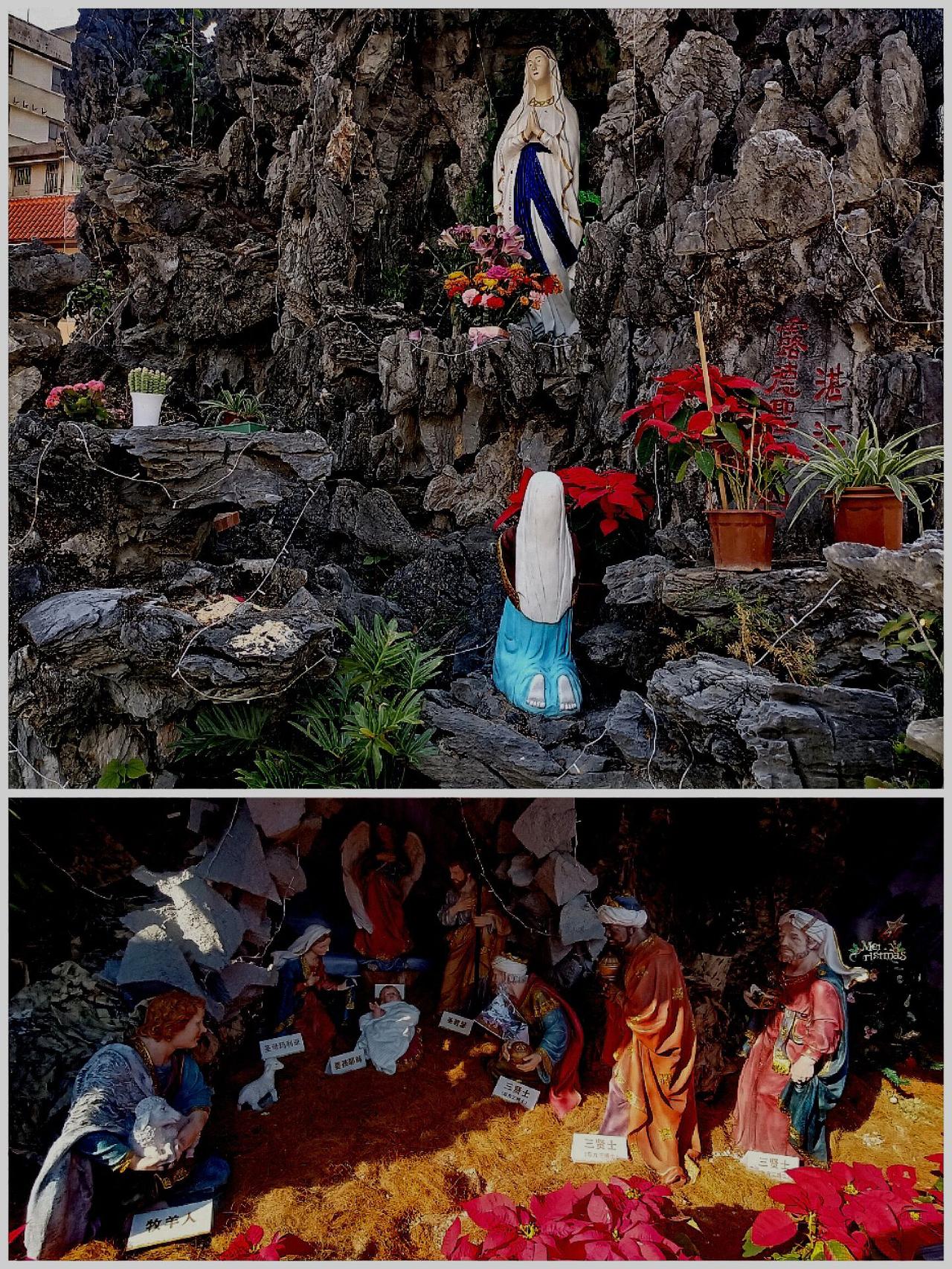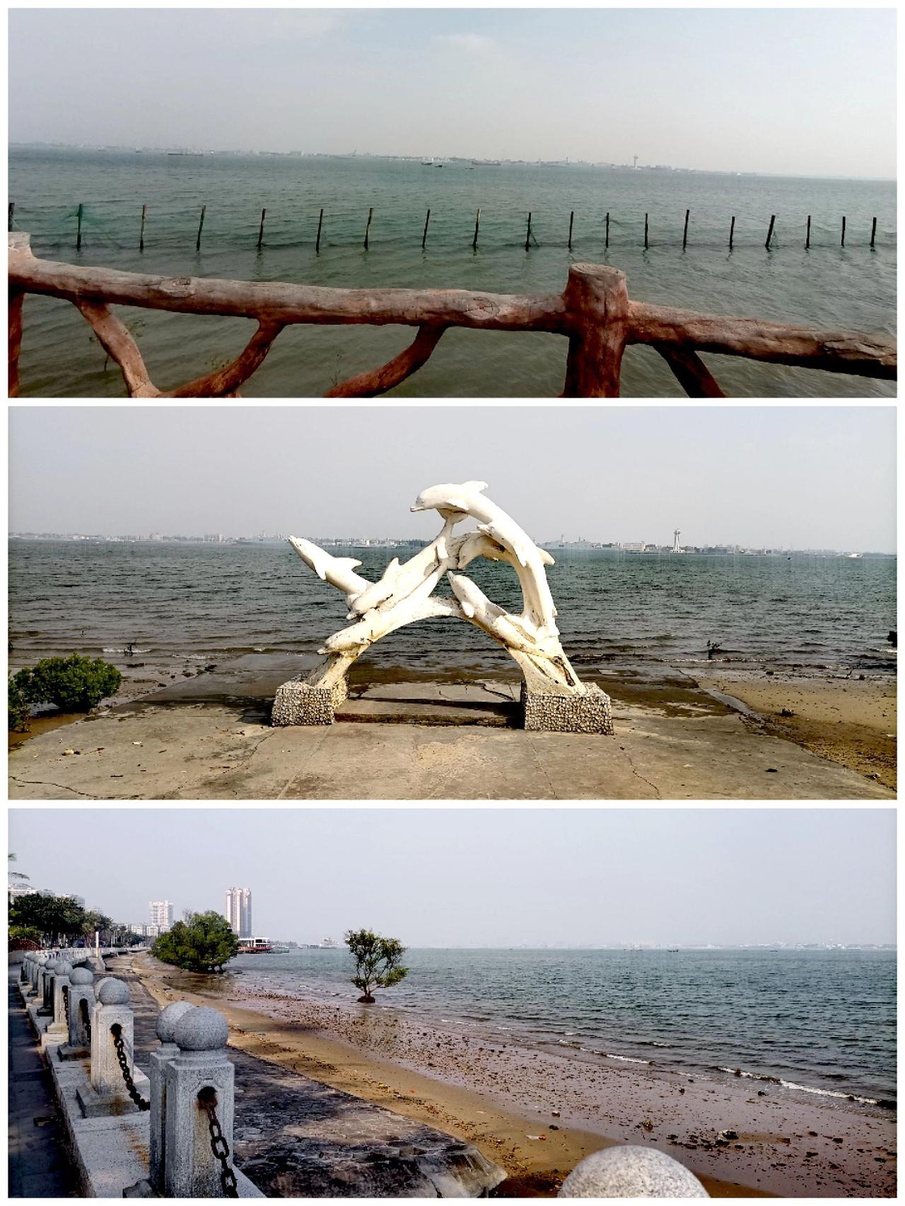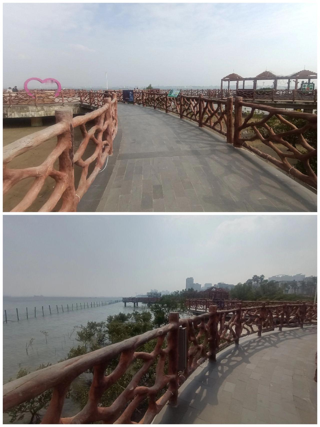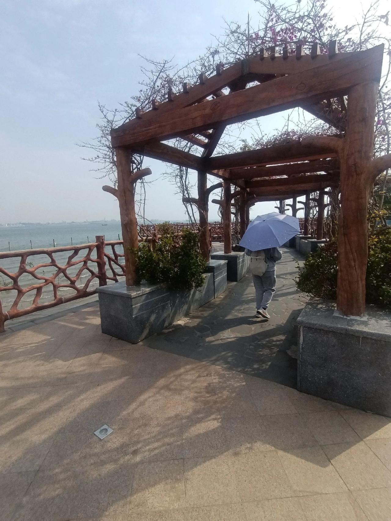 去霞山观海长廊开始很沮丧,因为正在围墙内大修进不去,无奈右转随便逛海边,却发现不知名的海上超长栈道,足足走了一个多小时(图1-7)。 栈道已伸入深海,非常浪漫迷人;波光粼粼的大海,曲曲弯弯的栈道,在阳光的映照下绚丽多彩;走在栈道上,吹着海风,晒着太阳,暖暖的清爽舒服。 接下去驱车去了法国建造的霞山天主教堂(图8),教堂墙内人来人往,教堂又关门了,不能学学佛庙天天开门吗?那就拜访路德圣母吧(图9)!