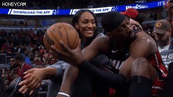好家伙!比赛没看到被热巴狗粮喂饱了! 在今天NBA常规赛热火与公牛的比赛前,现场因漏水问题球迷足足等了两小时依旧没能看到比赛! 但他们并不沮丧,因为他们今天被阿德巴约与威尔逊这对热恋中的情侣彻底喂饱了!两位全明星球员还是应该趁早结婚,他俩生下来的小孩,基本预定未来超巨名额!