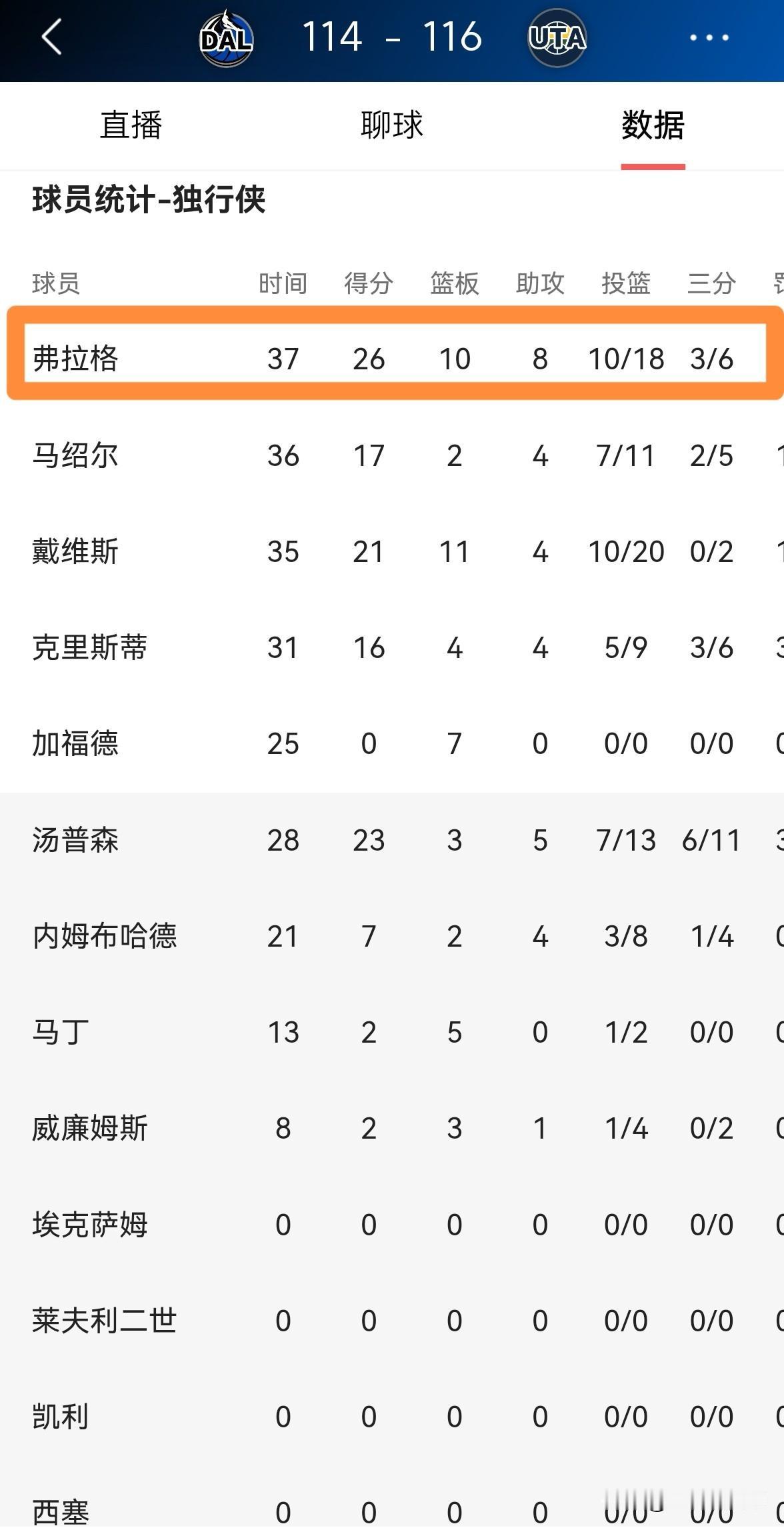 独行侠状元郎弗拉格真是天赋卓绝,他是一名极其全能的球员!在今天独行侠客场以114:116不敌爵士的比赛中,弗拉格将自己无与伦比的篮球天赋展现的淋漓尽致。全场比赛下来,弗拉格首发出战37分钟,投篮18中10,其中三分球6中3、罚球4中3砍下26分10篮板8助攻3抢断1盖帽,他的场上正负值为+3。 实事求是的说,即便是在NBA历史上,能够像弗拉格这样身手全面、攻防兼备的新秀也是凤毛麟角。