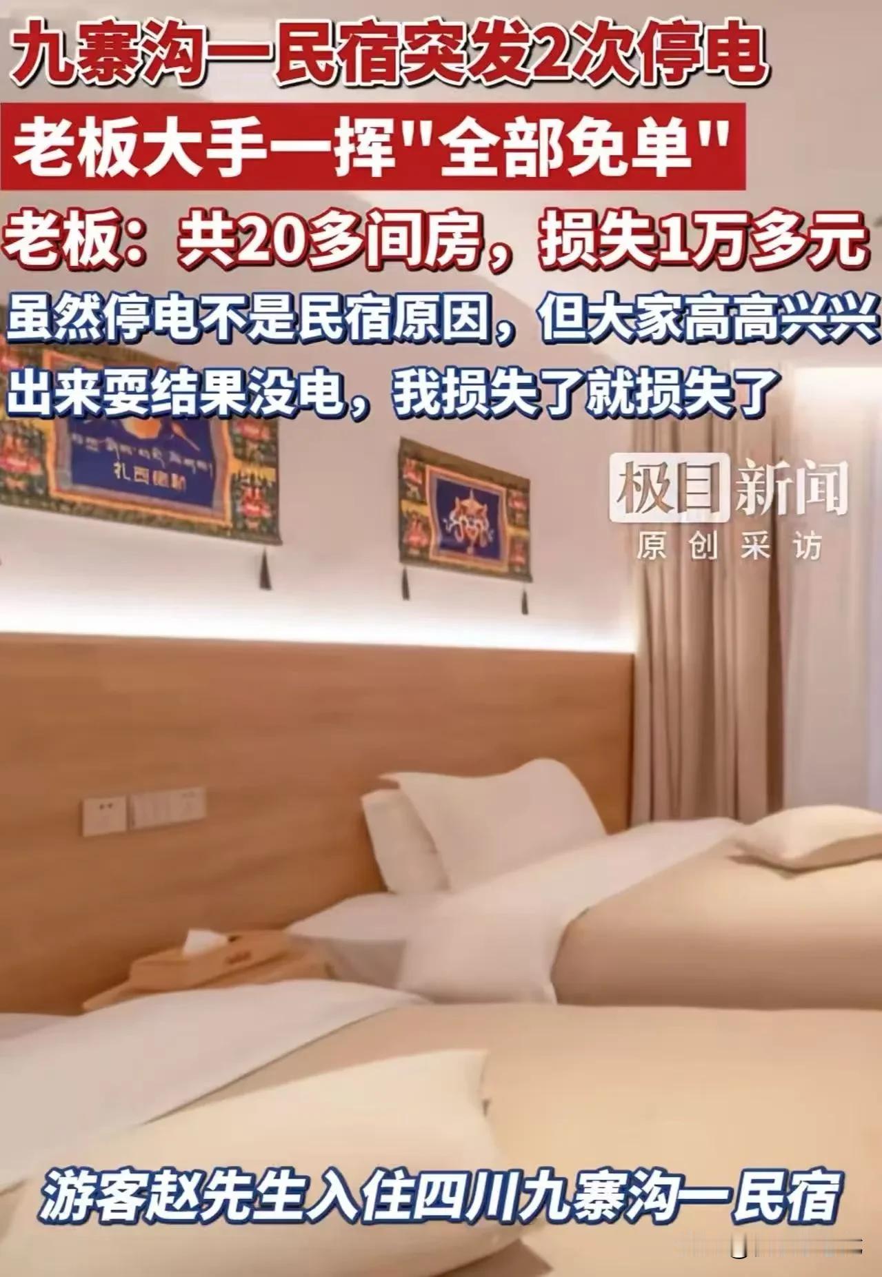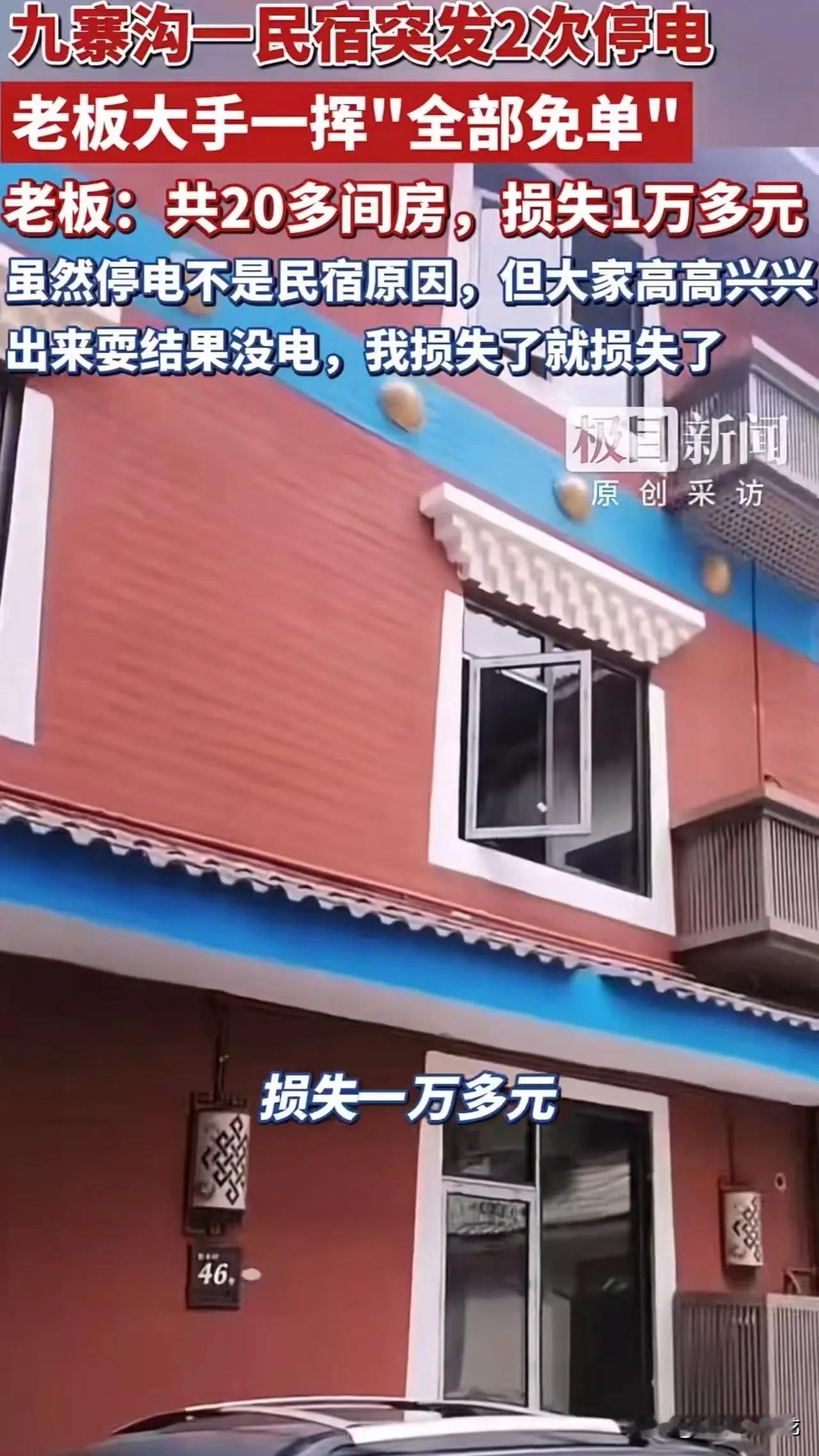 这家民宿老板火了!元旦,男子一家几口去九寨沟旅游游玩,花了500多定了一家民宿,结果晚上民宿停电了,男子郁闷不已。想让民宿老板打折,没想到老板说的一句话让他惊呆了。 元旦的九寨沟正是人挤人的时候,男子老早花了500多块订到这家民宿,想着能舒舒服服休息,刚吃完晚饭,屋里的灯突然灭了。 山里的晚上冷飕飕的,手机信号也弱,孩子嚷嚷着要开灯看动画片。男子穿好衣服就去找老板,想找他扯皮,怎么也得退个一百多来块,不然这趟太亏了。 民宿老板是个皮肤黝黑的四十来岁的大哥,他正蹲在院子里鼓捣发电机。看见男子过来,赶紧站起身搓搓手。 男子刚把停电的不满说出口,还没提打折的事,老板先开口了:“兄弟,实在对不起,山里线路老化,突然跳闸了。今晚的房费我全退给你,一分不少。”听完这话,男子愣住了。 他本来想着能退一半就不错,没想到老板直接说全退。老板接着说,发电机一时半会儿修不好,怕他们一家人冻着,还主动提出帮忙联系附近的民宿,要是人家有空房,就开车送他们过去。 从屋里端出几杯热姜茶,还有一筐烤得热乎乎的红薯,让他们先暖暖身子。男子一家人捧着热红薯,心里的火气一下子就消了。 后来他才知道,那天晚上停电的不止他们一家,民宿里的十来个客人,老板都全额退了房费,还免费提供了热饮和零食。 说句实在话,现在做生意的,遇到这种突发情况,能主动退钱的真不多。有的商家顶多免个早餐,或者下次来住打折,哪会像这个老板一样,二话不说全额退款。 做生意说到底做的是人心,老板亏了一晚的房费,却赚来了好口碑,以后大家去九寨沟,指定都愿意往他的民宿跑。那些总想着在小事上算计客人的商家,看似赚了点小钱,其实丢的是长远的生意。 这位民宿老板的做法,厚实是聪明的经营之道。做生意说到底,拼的不是装修多豪华,价格多便宜,是那份把客人当朋友的心意。你给客人一份真诚,客人就会还你一份口碑。这口碑传出去,可比打多少广告都管用。 各位读者你们怎么看?欢迎在评论区讨论。
