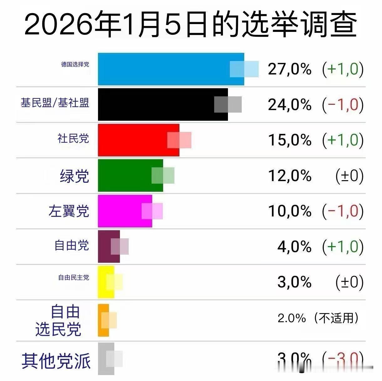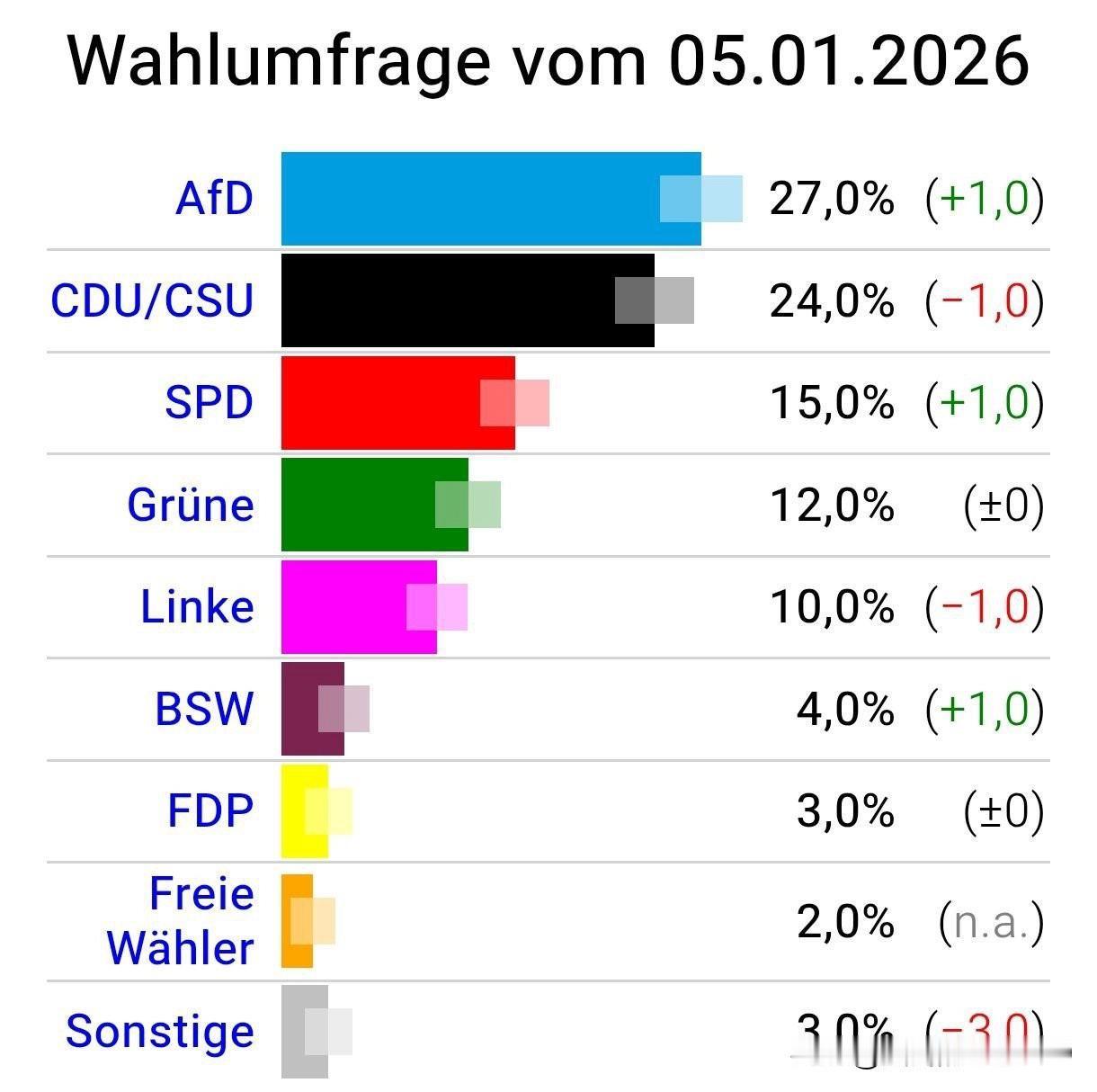 德国右翼选择党(AfD)在1月5日的一次民调中,历史性领先默茨领导的执政联盟。 在这一新的民调结果显示,反乌克兰、反移民的德国选择党目前获得 27% 的选民支持,而基民盟 / 基社盟的支持率为 24% 这 3 个百分点的优势,标志着选择党获得了有史以来的最高支持率和最大领先优势 而这一转变发生之际,默茨的支持率创下了德国现代史领导人的最低纪录。