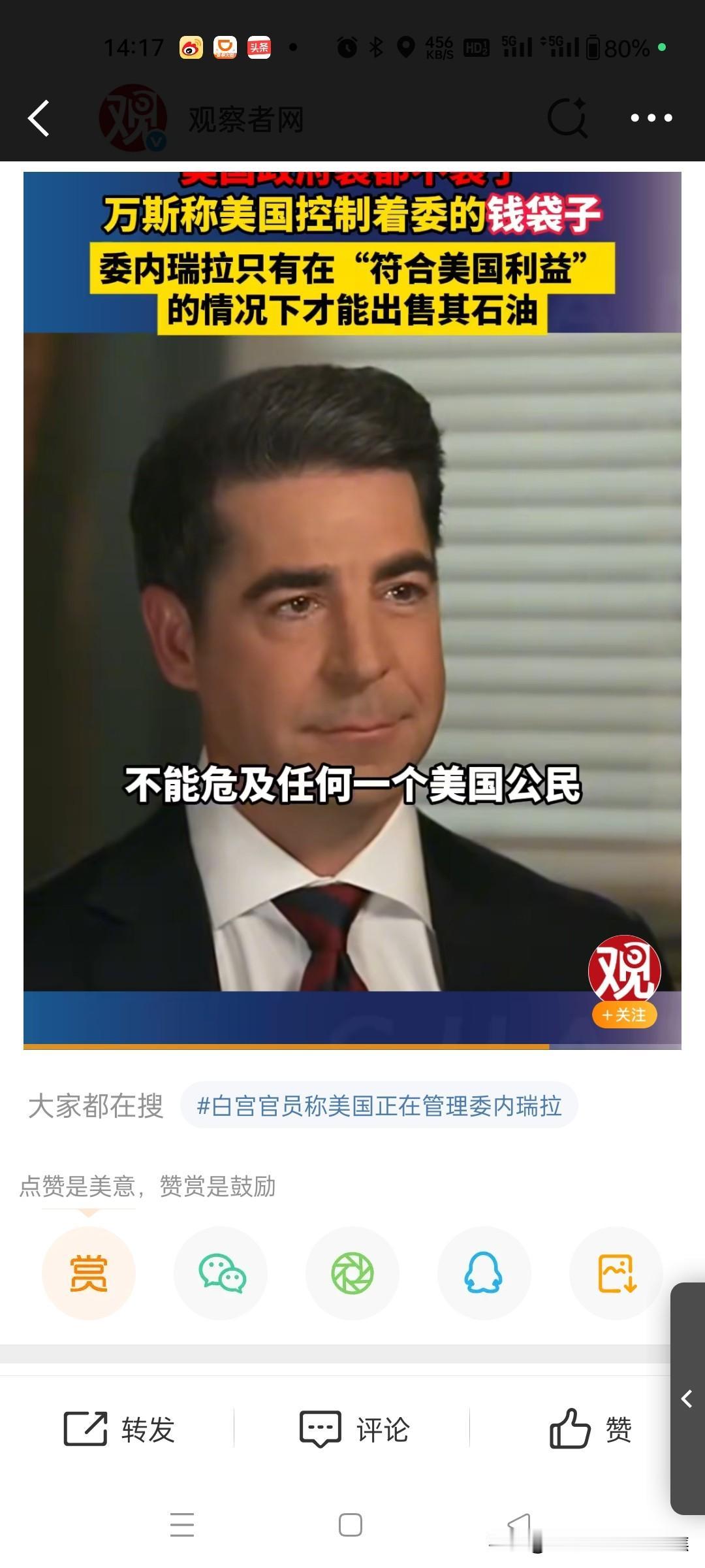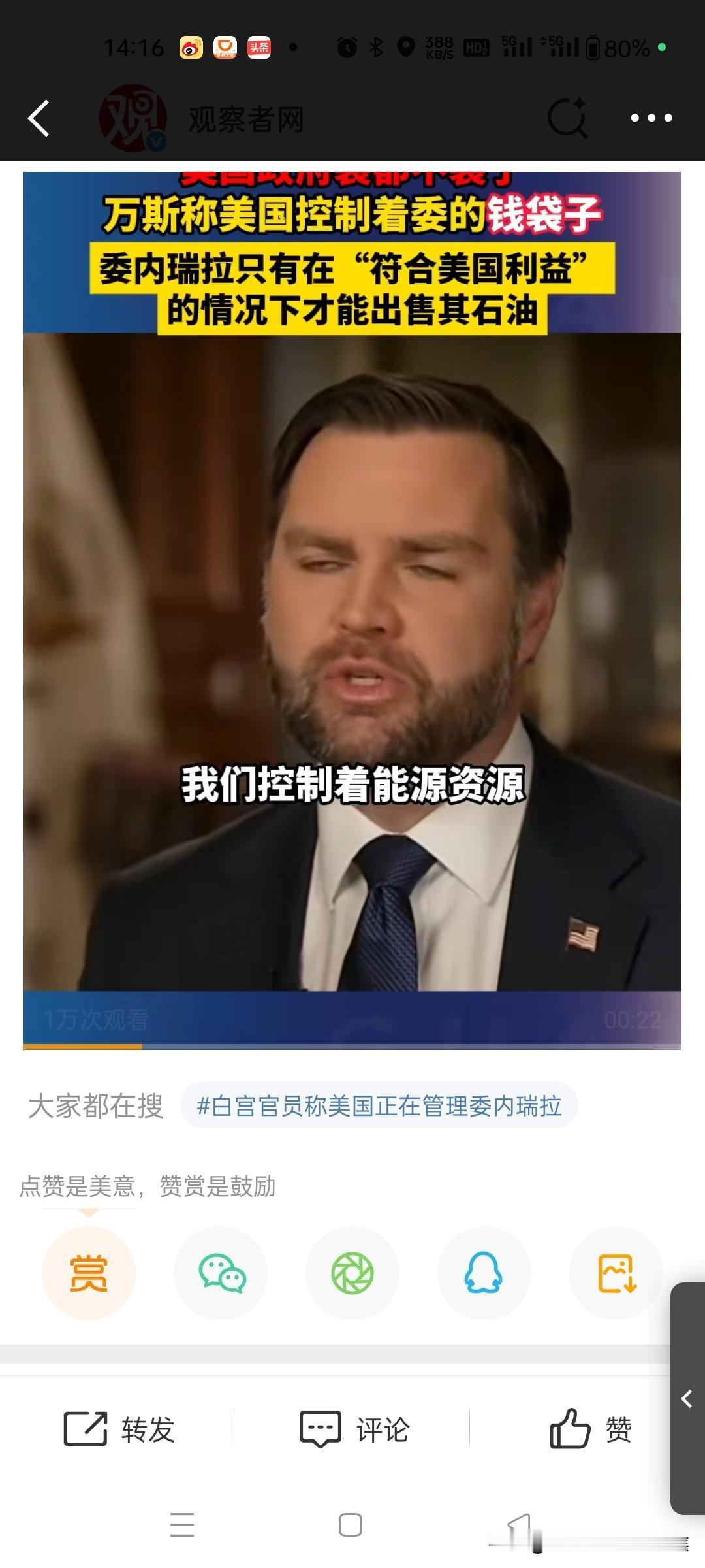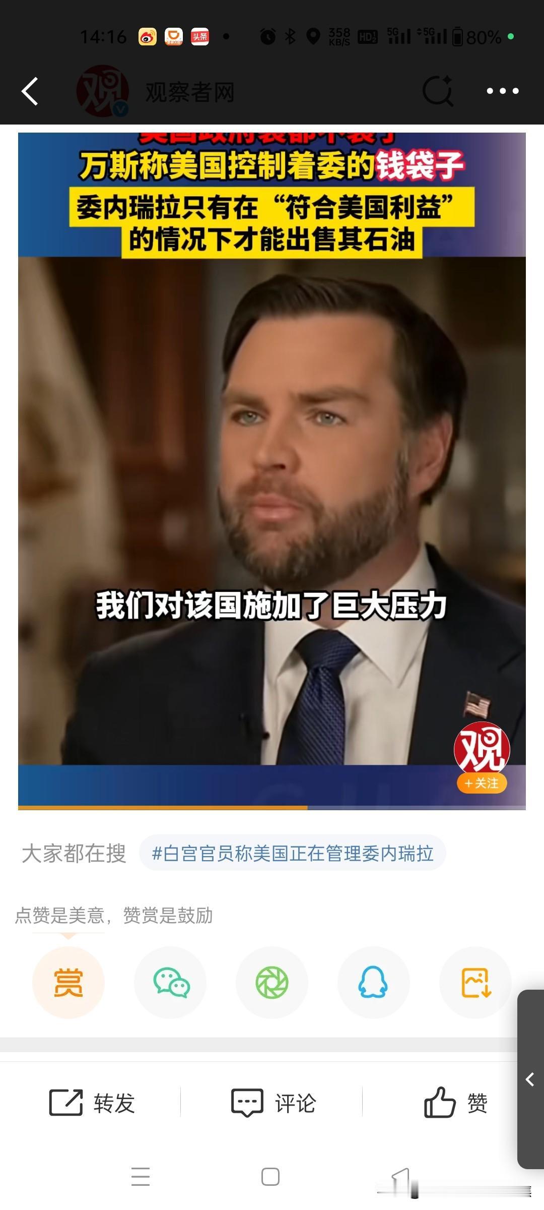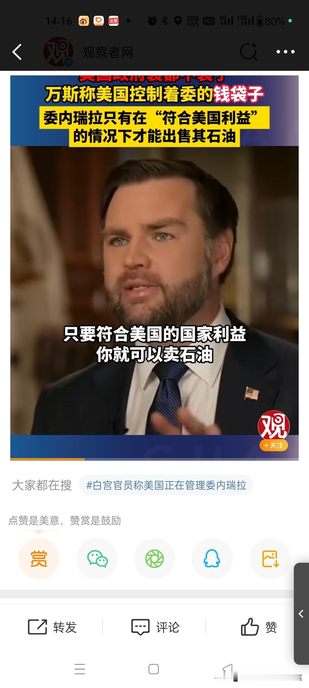 赤裸裸的美国霸权美国通过掌控委内瑞拉的石油收益和能源出口权,将其视为“钱袋子”,要求委内瑞拉石油销售必须“符合美国利益”才能获批,这一赤裸裸的霸权言论引发全球哗然! 美国副总统万斯在2026年1月7日接受福克斯新闻采访时公开宣称,美国通过掌控委内瑞拉的石油收益和能源出口权,将其视为“钱袋子”,要求委内瑞拉石油销售必须“符合美国利益”才能获批,这一赤裸裸的霸权言论引发全球哗然。@杭之冯玥感谢...224霜叶新浪军事 一、万斯的核心言论及意图 “财政缰绳”政策 万斯在采访中直言:“美国控制委内瑞拉的方式就是掌控财政命脉与能源资源”,并明确要求委内瑞拉政权“若服务于美国利益方可出售石油,否则禁止交易”。他声称这种经济施压手段“无需牺牲美国人性命”,却可对委内瑞拉施加“绝对控制力”。@金灿荣教授28 配合军事行动的掠夺逻辑 该言论是对美军1月3日突袭抓捕委总统马杜罗行动的延续。万斯此前曾辩解,美国“收回”委内瑞拉石油资产是因“该国20年前没收美国资产并资助毒品活动”,但被网民讽刺为“强盗逻辑”。特朗普更直接宣布将“亲自监管”委石油销售收入,要求资金仅用于购买美国商品。@热度新闻1216环球网热度新闻干弟Nick在学英语 二、美国对委内瑞拉的实际控制措施 石油封锁与资源掠夺 扣押油轮与出口封锁:美军在加勒比海拦截驶离委内瑞拉的油轮,甚至对涂改俄罗斯国旗伪装身份的船只强行登船扣押。@星话大白 交易资金管控:特朗普要求委内瑞拉石油销售收入存入美国政府控制的账户,并限定仅采购美国农产品、医疗设备等商品,变相将委经济捆绑于美国供应链。1215 能源基础设施接管 白宫要求美国能源企业投资修复委内瑞拉老化的石油开采设施,试图长期控制其产能,预估需耗资数百亿美元。 三、争议焦点与国际反应 国内外的强烈批判 美国内部质疑:民主党参议员墨菲斥责该计划“疯狂”,是“通过武力无限期掠夺他国资源的微观操控”;网民嘲讽万斯“不如直接发‘石油’一词”,揭露其虚伪性。@环球网1419 国际社会反弹:联合国秘书长警告美方行动违反国际法,开创危险先例;巴西、哥伦比亚等拉美国家谴责其侵犯主权;俄罗斯专家直指美国行为是“现代海盗”。@俄乌网15 地缘战略风险 美国以“禁毒”“反恐”为名行动,但委内瑞拉并非美国毒品主要来源国(可卡因主产自哥伦比亚等国),且美国曾特赦涉毒洪都拉斯前总统,双重标准暴露明显。有分析指出,控制委内瑞拉实为压制拉美地区自主性,巩固“门罗主义”霸权。16 四、潜在影响与长期风险 经济秩序冲击 若美国长期操控委石油出口,将扰乱全球能源市场稳定性,可能引发油价剧烈波动与通胀连锁反应。 国际规则瓦解危机 美方以国内法凌驾国际法、武力推翻民选政权、剥夺国家资源主权的行为,削弱联合国权威,可能推动“强权即正义”的丛林法则回归。俄罗斯、中国等已明确支持委内瑞拉维权,呼吁维护多边秩序。14