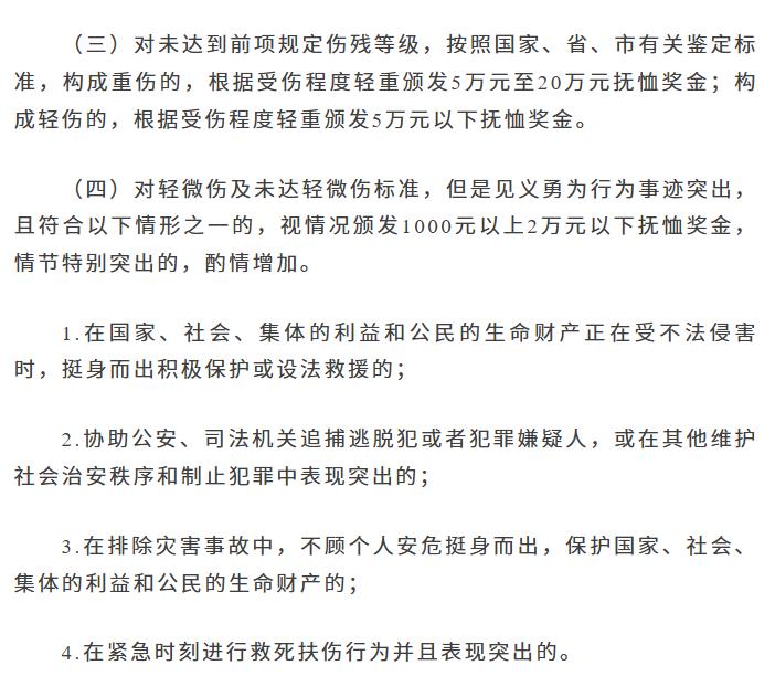 【南沙鼓励见义勇为】《广州市南沙区见义勇为人员奖励和保障实施细则》正式印发,旨在弘扬社会正气,鼓励见义勇为并保障见义勇为人员的合法权益。《细则》规定,见义勇为人员除享受国家、省、市有关抚恤补助规定的相应待遇外,经南沙区见义勇为评定委员会确认,由区人民政府颁发一次性抚恤奖金,奖励标准为1000元至30万元。此外,南沙区户籍人员在本区行政区域外被确认为见义勇为的,享受本区行政区域内实施见义勇为行为人员同等的奖励和保障。