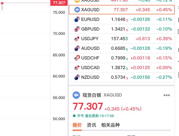 快讯,快讯! 现货白银翻红了。 我们知道,今日现货白银 震荡运行,略微低开; 不过刚刚止跌回升, 快速翻红了,又跌转升了。 现货白银报价77.307美元, 较上一日上涨0.345美金, 涨幅不大,仅仅为0.45%。 但这是不是一个好的开始? 当然对于白银期货, 期货小褚观点不变!