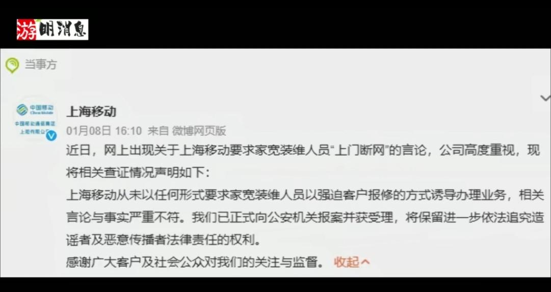 刚刚看到抖音一个短视频,上海移动的三个装维师傅实名举报上海移动:对移动早期装的宽带只有50元套餐的,被上海移动认定为低质客户,要求装维师傅上门给客户升级套餐,如果客户不配合的话,就要给客户断网,如果装维师傅不执行断网,没有执行到位,装维师傅就被受到降级、罚款、甚至开除的威胁。但是上海移动辟谣说没有这种事情,已向公安举报,要追究造谣者的一切责任。 站在一个普通客户的角度,我相信上海这三个移动的装维师傅讲的是事实!相信很多朋友都经历过被运营商莫名其妙乱收费,莫名其妙被断网,莫名其妙被强制升级套餐的行为,甚至有些莫名其妙被捆绑了一些不需要的收费套餐,莫名其妙被扣了好多年!想停都很难,想转网也很难。 这三个上海移动的装维师傅,还有一点良知,肯定是觉得这样做对不起客户,才会拿到身份证实名举报,冒着自己被丢饭碗的风险!不然不可能好好的在中国移动上班,敢这样实名举报。这三个上海移动的装维师傅接下来肯定会丢饭碗,但希望他们的勇敢的行为会唤起中国上海移动的自我反省,而不是强权意识! 虽然现在运营商有中国移动、中国联通、中国电信、中国广电,但是这些都是国有企业,还是带有垄断性质。其实,如果运营商有外资的介入,相信他们的服务会更上一层楼。如果马斯克进入中国运营商,马斯克有自己的卫星,我们运营商的收费、服务会明显改变,相信收费会更低,服务会更好! 竞争才是最好的改进提升、措施! (图片来源网络,如有侵权,请联系删除)