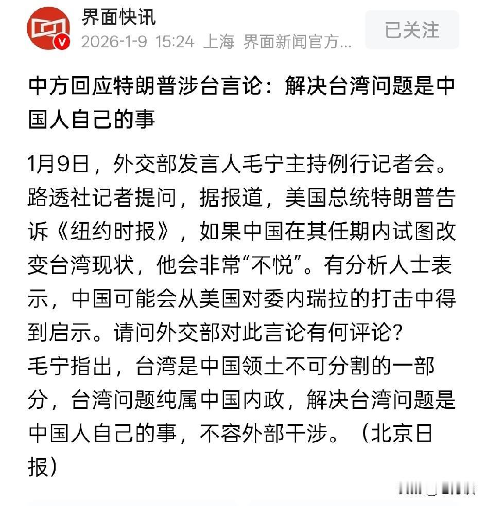 特朗普对外表示,如果我们在他的任期内试图改变台湾现状,他会非常不悦。解决台湾问题是中国人民自己的问题,跟美国毛线关系都没有。特朗普的言论完全就是干预我们的内政,他高不高兴跟我们一毛钱关系都没有。我们就是要收回台湾,解决台湾问题,至于特朗普根本不是我们考虑的范围。所以特朗普高不高兴,快不快乐,跟我们有什么关系呢?有舆论称,特朗普在 1 月 20 号将是人生重大关卡,那么大家都在等最后的十几天会发生什么稀奇的事情。