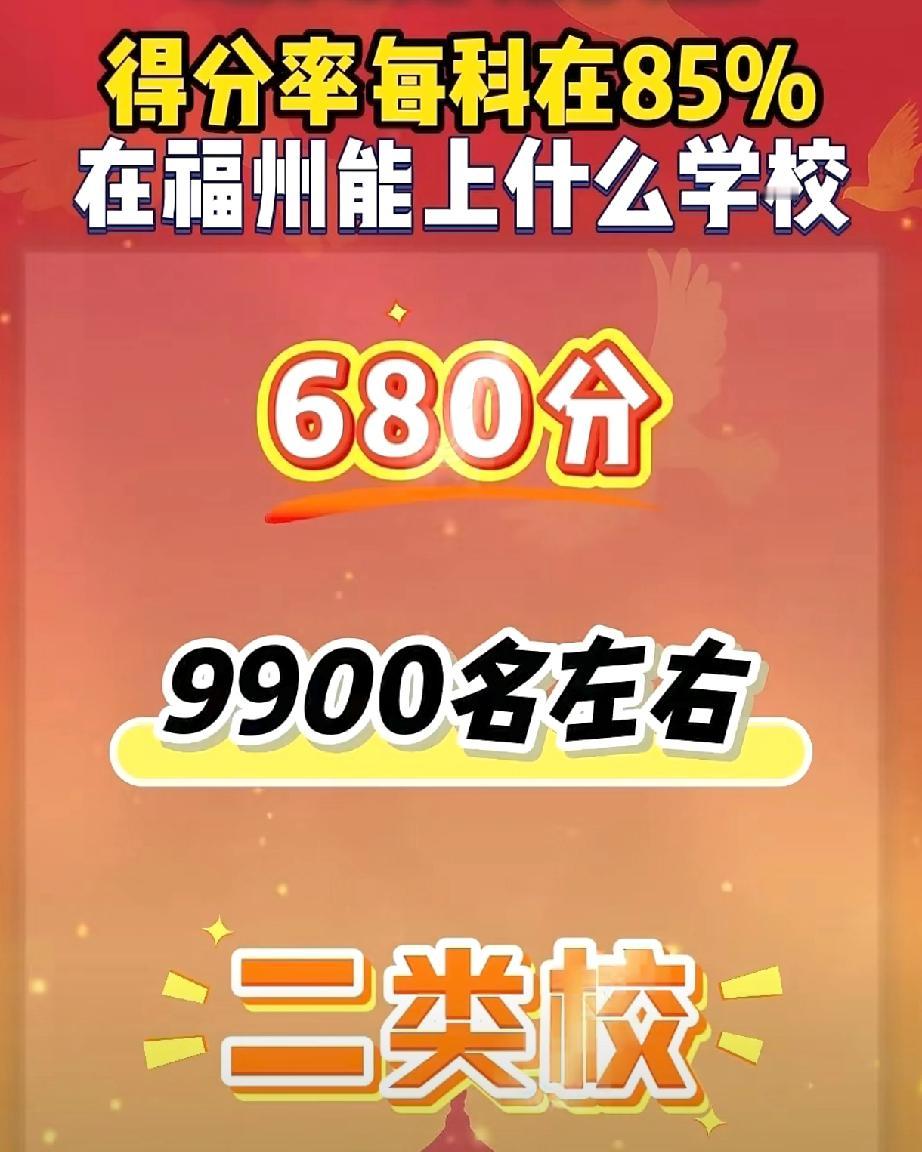 福州中考得分率每科在85%,能在福州上什么高中?先说结论:稳进二类校高中,也能挤进一类校后排几所,比如福州七中。举例子:金山中学最低681.5分,清华附中和华侨中学至少674.5,优质高中一类校的守门员福州七中定向最低至少要660分,市排名最低要在约9300名之前。