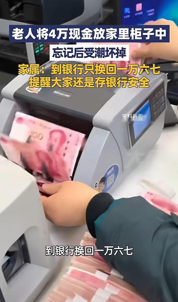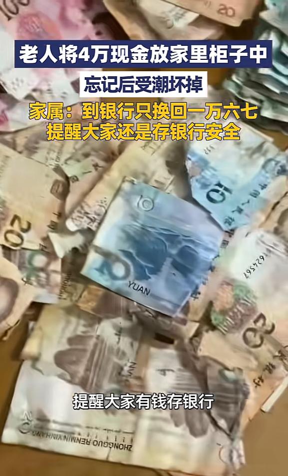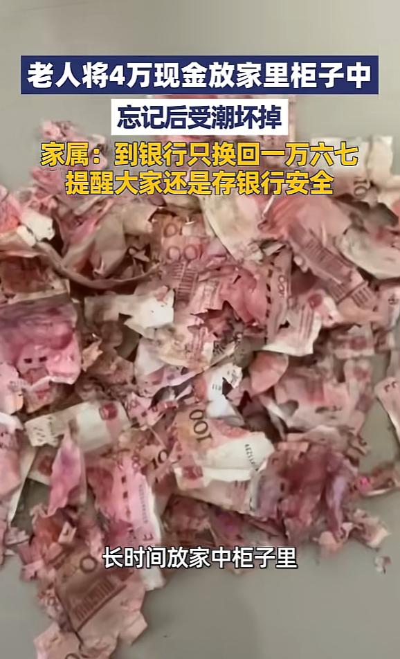 “悲剧还是发生了!”近日,江苏宿迁,一老人将4万现金一直放在家中柜子里,结果时间一长就忘了,等老人想起查看时,发现全部受潮坏掉了,最后去银行,也只换回一万六七元,这可把老人心疼坏了。网友:心真大啊! 近日,江苏宿迁一位老人的遭遇让不少人看完都忍不住揪心。辛辛苦苦攒下的4万现金,被她小心翼翼地藏在家里柜子里,结果日子一长竟彻底忘了这回事。 等再次想起去查看时,眼前的景象让老人瞬间崩溃——整沓的现金全都因受潮变得霉烂不堪,不少纸钞已经碎成小块,粘在一起根本无法分开。最后抱着一丝希望去银行兑换,也只换回了一万六千多元,大半辈子的积蓄打了水漂,老人心疼得直掉眼泪。 这4万块钱,是老人一点点省吃俭用攒下来的“养老钱”。平时老人花钱格外节俭,买菜要货比三家,衣服更是穿到旧得不能再穿才舍得换,就连日常的水电费都要精打细算。 之所以选择把钱藏在家里柜子里,老人也是出于朴素的想法,觉得现金放在自己身边最安心,担心存到银行里手续麻烦,也怕自己年纪大了记不住密码,没成想这个决定最后酿成了遗憾。 藏好钱后,老人的生活依旧按部就班,每天买菜、做家务、和邻里聊天,日子平淡又规律。随着时间一天天过去,她竟慢慢把柜子里藏着4万现金的事抛到了脑后,柜子也成了家里最不起眼的角落,再也没被特意打开过。 直到最近,老人整理家中物品,无意间拉开了那个许久未动的柜子,才猛然想起自己还藏着一笔钱在里面。 可当老人满怀期待地去翻找时,手刚碰到钱就僵住了。原本整整齐齐、崭新的纸钞,此刻已经完全变了模样,表面布满了黑色的霉点,散发着潮湿的霉味。 更让人崩溃的是,大部分纸钞都因为长期受潮变得脆弱不堪,轻轻一碰就会掉渣,还有不少已经粘连成硬块,用尽办法也无法完整揭开。看着自己攒了大半辈子的积蓄变成这副模样,老人当场就愣在原地,眼泪止不住地往下流。 家人发现老人的异常后,赶紧过来查看,看到柜子里的现金时也心疼不已。平复好心情后,家人第一时间带着老人和这包损毁的现金赶到了附近的银行,希望能尽量挽回一些损失。 银行工作人员见状,立刻拿出专门的工具,小心翼翼地对这些受潮、碎裂的纸钞进行分拣、清理和拼凑,整个过程格外繁琐,每一步都要轻手轻脚,生怕再对纸钞造成二次损坏。 经过工作人员长时间的细致处理,老人的这4万现金中,很多都碎成了无法拼接的小块,最终只能兑换回一万六千多元,相当于大半积蓄都打了水漂。 拿到兑换的现金时,老人的手都在发抖,反复摩挲着崭新的纸钞,脸上满是惋惜和心疼。她怎么也没想到,自己精心藏起来的钱,最后会以这样的方式损失大半。 这件事被家人分享到网上后,很快引发了网友的热议,不少网友直言“心真大,这么多钱藏家里竟然能忘了”,也有网友感同身受,说家里老人也总喜欢把钱藏在家里各个角落,劝了好多次都不听。 对于老年人来说,把现金存入银行其实是更稳妥的选择,不仅能避免受潮、虫蛀、被盗等风险,还能获得一定的利息。 如果担心记不住密码,完全可以让子女陪同办理,将密码设置成容易记住的数字,或者让银行工作人员帮忙备注提醒。 就算实在想在家存放少量应急现金,也应该选择密封的塑料盒或专门的纸币收藏册,存放在干燥通风的高处,并且定期查看状态。 江苏宿迁这位老人的遭遇,也给所有家庭提了个醒。平时多和家里的老人沟通,讲解现金在家存放的风险,引导他们选择更安全的存钱方式,才能避免类似的遗憾发生。毕竟每一分钱都凝聚着辛苦的付出,一旦因为存放不当受损,再后悔也为时已晚。 对此,你们有什么看法,欢迎评论留言~