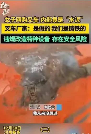 2025年12月30日,河南新乡,女子花了11805元拍了一辆叉车,她想着能将就着用就行,结果,叉车回来,钥匙都插不进去,她打开车盖,居然发现发动机是塑料花生油壶,她找来维修工帮忙修一下,还想着将就用,可是维修工又发现车身不对劲,他用切割机切割一看,发现车身居然是水泥浇筑的,她气得要把车给砸了。 女子当初竞拍这台叉车,想法很简单,就是想找台能将就着用的设备,帮着处理些货物搬运的活儿,不用太好但求能用。 对比了多款二手叉车的价格后,她最终以11805元的价格拍下了这台,满心期待着设备到货后能尽快派上用场。竞拍成功后,她还特意跟卖家确认了交货事宜,耐心等待着叉车运到。 终于盼到叉车到货的那天,女子早早地就在场地等候,可刚一见到实物,就发现了不对劲。她拿起钥匙准备启动叉车试试车况,可不管怎么努力,钥匙都插不进锁孔里,像是尺寸完全不匹配。 这让她心里咯噔一下,原本的期待瞬间凉了半截,难道是运输过程中出了什么问题?带着疑问,女子找来工具打开了叉车的车盖,想看看锁孔附近是不是被磕碰变形了。 可车盖一打开,眼前的景象让她惊得说不出话来:本该是发动机的位置,竟然空荡荡的,取而代之的是一个脏兮兮的塑料花生油壶,用几根绳子简单固定着,看起来格外滑稽又刺眼。 就算发动机有问题,女子心里还抱着一丝侥幸,想着或许能找维修工修一修,凑活着用也行。毕竟这一万多块钱已经花出去了,总不能让它彻底变成一堆废铁。于是她赶紧联系了附近的维修工,把情况跟对方说了一遍,盼着能有补救的办法。 维修工赶到现场后,仔细检查了叉车的外观和结构,越看越觉得不对劲。他跟女子说,这叉车的车身重量和质感都不太正常,比同型号的正规叉车重不少,而且车身某些部位的材质摸起来也很奇怪。 为了弄清楚真相,维修工提议用切割机切开车身看看内部结构,女子虽然心里发慌,但也想知道到底是怎么回事,就同意了这个提议。 随着切割机的轰鸣声响起,车身的外壳被慢慢切开,里面的东西让在场的人都傻了眼——原本应该是金属构件的车身内部,竟然全是凝固的水泥,一层一层浇筑得十分厚实。 维修工当场就直言,这根本不是什么能用的叉车,就是个用水泥增重、塑料凑数的“空架子”,别说用来搬运货物了,就连正常移动都成问题,完全是个不能用的废品。 听到维修工的话,女子积压的情绪瞬间爆发,气得差点就要冲上去砸车。她怎么也想不到,自己花一万多块钱买的竟然是这样一个劣质的拼凑品,卖家简直是明目张胆地骗人。她当初之所以选择竞拍,就是觉得能以相对实惠的价格买到可用的设备,却没料到会掉进这样的陷阱里。 其实女子遇到的这种情况,在二手工程机械交易市场并不少见。近年来,随着工程机械市场需求的旺盛,二手交易市场也变得鱼龙混杂,各种造假套路层出不穷。 有些不法卖家为了牟利,会用各种廉价材料拼凑设备,比如用水泥增重、用废旧塑料代替核心部件,再通过线上竞拍等渠道对外销售,利用买家“捡漏”的心理设置陷阱。 事发后,女子越想越委屈,一万多块钱对于她来说并不是小数目,原本想着能改善工作效率,结果却买了个废品。 她开始联系竞拍平台和卖家,想要为自己的损失讨个说法,可沟通起来并不顺利。看着眼前这台用水泥和塑料拼凑的叉车,她心里又气又悔,早知道当初就该多留个心眼,仔细核实设备的真实情况。 对于很多中小企业主和个体经营者来说,购买二手工程机械是降低成本的常见选择,但市场中的各类陷阱却让他们防不胜防。 这也提醒着更多人,在进行二手设备交易时,尤其是线上竞拍,一定要选择正规的平台,尽可能实地验机,或者委托专业的第三方机构进行检测,避免因为一时疏忽而遭受经济损失。 对此,你们有什么看法,欢迎评论留言~