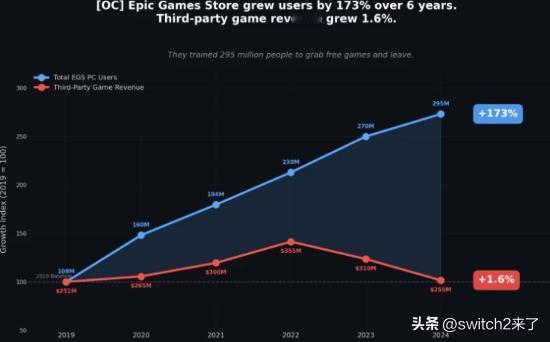 据悉,六年内Epic Games Store的用户数量增长了173%。与此同时,同一时期来自第三方游戏的收入仅增长了1.6%。 根据公司自身数据,这段时间内该商店吸引了2.95亿用户。大部分用户主要只领取免费游戏,并没有带来相应的销售额增长。