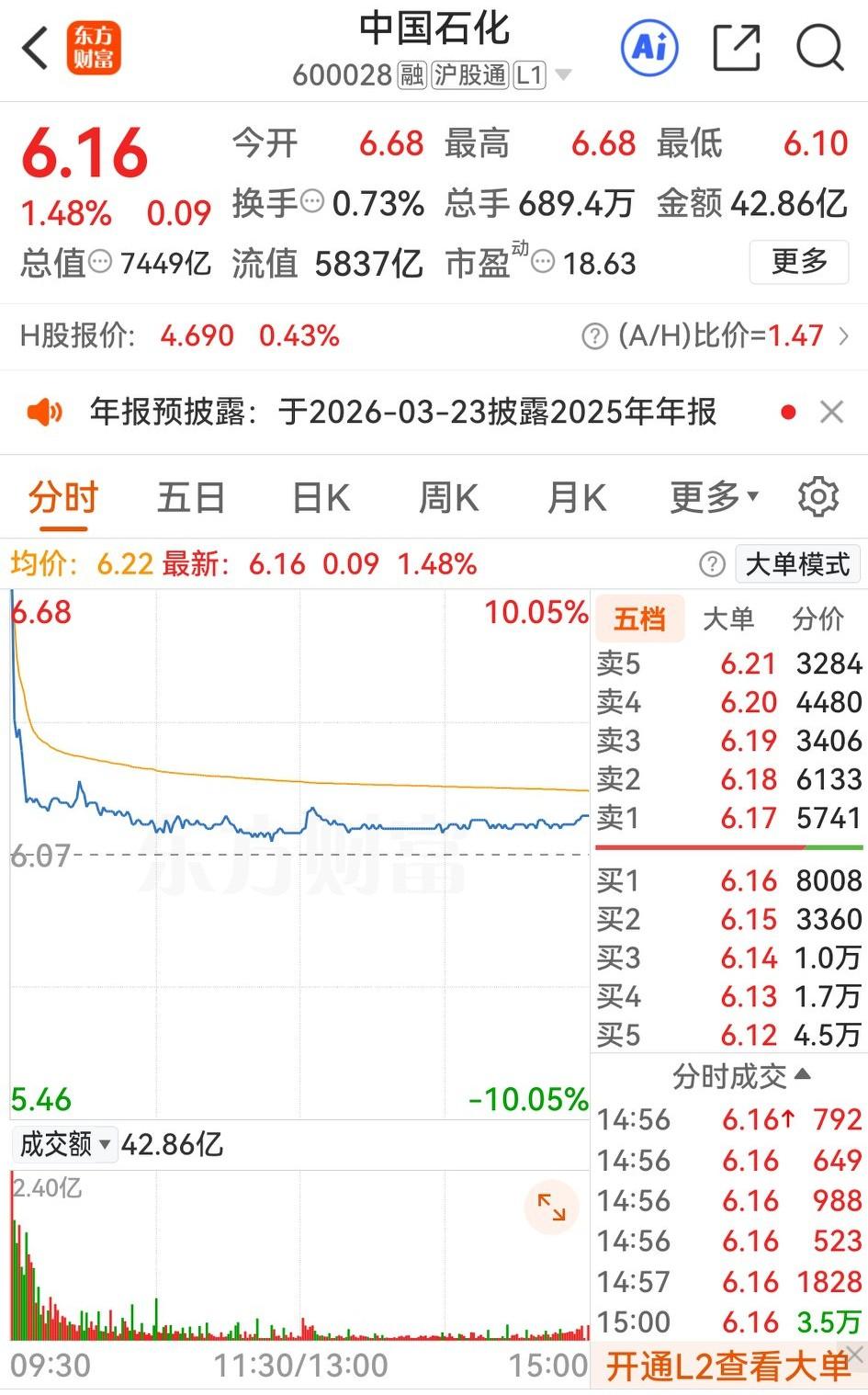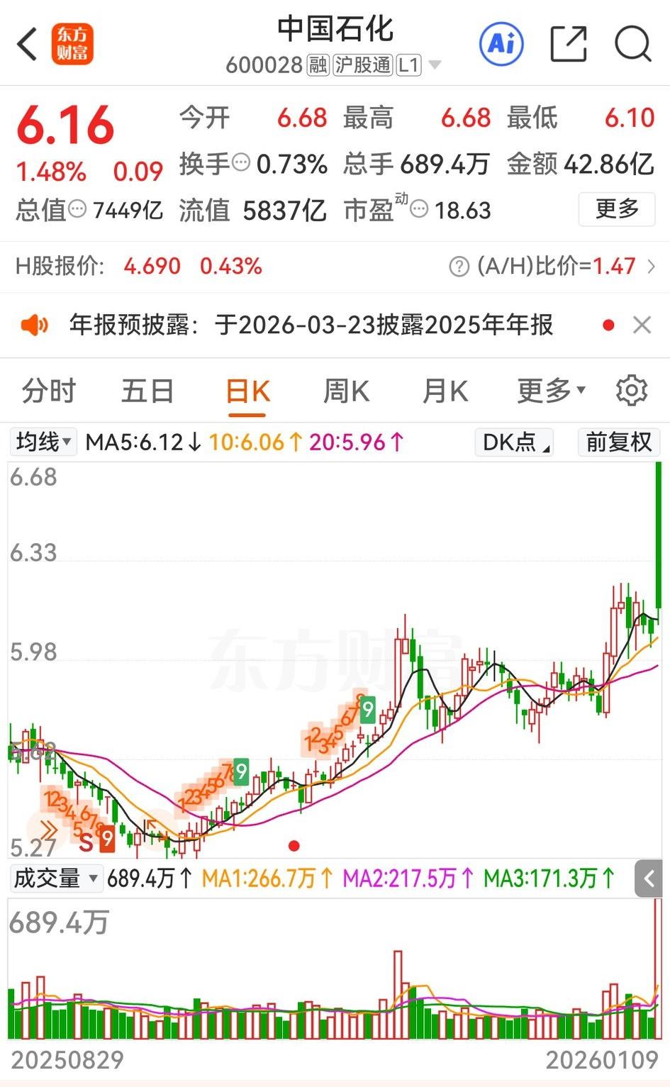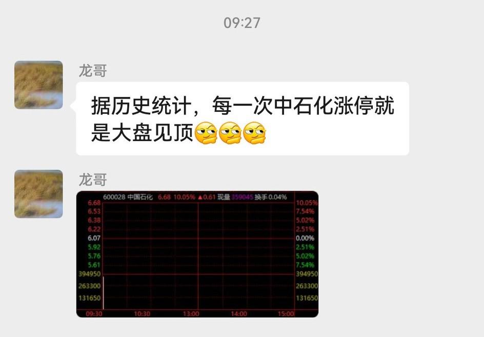 有群友总结:中石化每次涨停,大盘都是见顶。那么,今天中石化集合竞价打板,随后就跳水走低,日K收出了近9%的巨阴,是否符合大盘见顶的特征? 一方面,从走势看,中石化是受与中航油重组刺激驱动开盘涨停,但连续竞价开始一秒都没等就直接奔零,应该不算真正涨停。另一方面,控大盘者的意图,与前天中信证券14.5亿元压单如出一辙,不能让大权重毁了长牛慢牛的前程。 但也要看到,大盘全天成交达3.12万亿、两融达2.6万亿,展现出疯狂的赌性,让人触目惊心。下周起,是板块轮动高低切,还是大盘整体调整,都有可能,兄弟们多少还要保持一点清醒。 如果对中石化是否板不迷信,那就在控仓前提下,在大科技里弃强拣弱,潜入商业航天、脑机接口之外休养生息已久、即将捂热的AI算力、机器人、智能驾驶、数据中心等冷门个股,争取陆续火上一阵。