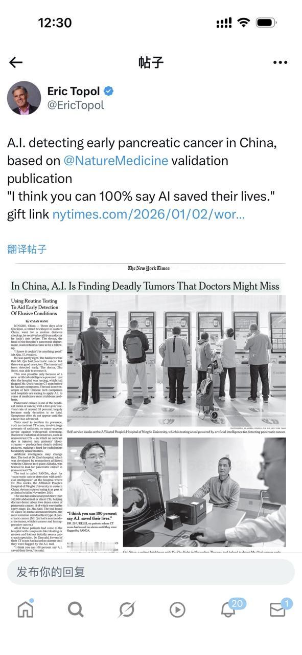 美国网友陷入集体焦虑:美国的AI在抢他们饭碗,而中国AI居然在救命。 1月2日,美国掀起了另一场“AI反思风暴”。纽约时报的评论区迅速被美国网友“攻陷”了。当天,《纽约时报》罕见用整版头条报道了中国一个看似普通但极具震撼力的故事:57岁的宁波退休砖瓦工邱先生,在一次常规CT检查中被AI发现患有早期胰腺癌,最终被成功治愈。 把AI新技术用于医疗,这件利好全人类的好事,在美国引起反思。有网友表示“我们花几百亿美元卷AI大模型,结果卷出来的是虚拟女友和炒股机器人,而中国的AI却用在了癌症早筛。” 还有网友赞叹“终于有媒体写点靠谱的AI应用了!中国这才是走在正路上的AI。”就连Scripps研究所所长、美国国家科学院院士都亲自转发该报道,评价它“中国AI拯救了他们的生命。”。 要知道,以往的大家讨论AI,总是集中比较“谁的模型更大、更强”,但如今,中国AI正在扭转这种现象,“谁真正把技术用在了人身上”成了更重要的问题。 这项新技术其实名为PANDA模型,是阿里达摩院5年研发投入,累计已在国内多家医院部署,精准分析超18万张CT影像,成功发现超百例胰腺癌病灶,其中一半以上为早期,拯救了不少人的生命。 值得注意的是,这只是阿里医疗AI“低调布局、高强度落地”的冰山一角。在24年的时候,这项技术就在浙江丽水开启公益试点,免费给当地老百姓提供AI癌症筛查服务,目前累计服务2000多万人次,。让AI技术真正走进寻常百姓家。甚至连GE医疗、世卫组织等权威机构都在和达摩院展开合作。 事实已经证明,技术从来不是用来炫耀的,而是用来帮人的。当中国AI在宁波救人,美国AI沦为资本的游戏的时候,这场“路线之争”的胜负,其实早就有了答案。