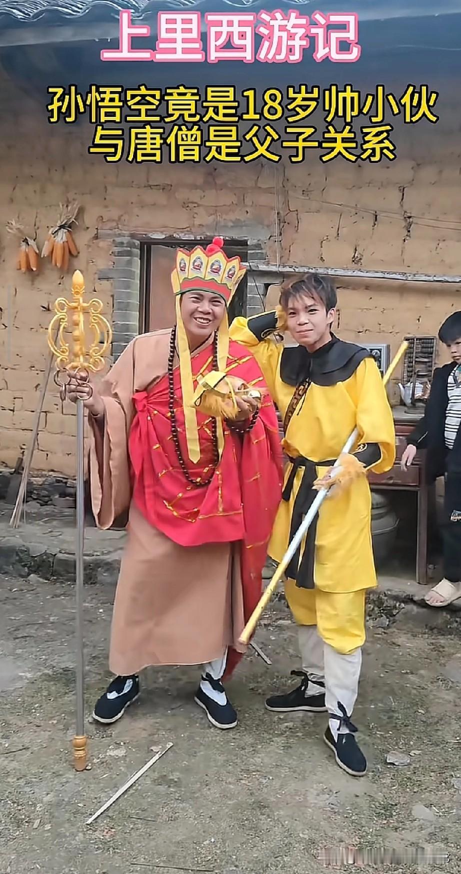 18岁小伙演悟空竟和唐僧是父子 刷到一个农村翻拍的《上里西游记》直接看懵了!没有华丽布景,土坯房当背景,18岁帅小伙扮的孙悟空耍着金箍棒,动作虽青涩却透着一股认真,更离谱的是,剧情里悟空和唐僧居然是父子关系,这设定直接打破童年认知。 扮演者都是当地村民,唐僧的袈裟是红布缝的,金箍棒就是根涂了漆的木棍,道具简陋到好笑,可他们演得却格外投入,镜头前的笑容特别真实。 这种民间翻拍没有流量明星,全靠热爱支撑,看着既接地气又让人觉得暖心。 不过有人说这是瞎改经典,糟蹋了《西游记》的内核;也有人觉得民间创作就该有脑洞,你觉得这种颠覆经典的民间翻拍该不该被支持?