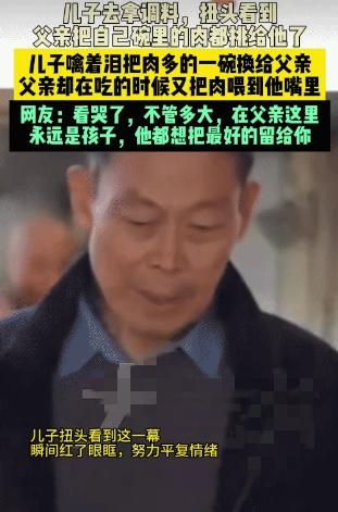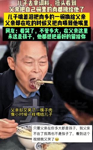 泪目了!河南一50多岁男子带这老父亲去面馆吃面,父亲却在儿子转身去取调料时,偷偷将自己碗里的肉夹到了儿子碗里,而这一幕都被儿子看在了眼里,这么大年纪了,父亲还把自己当做小孩,瞬间红了眼眶,坐下后默默将自己的碗与父亲对换了一下,而父亲接下来的举动让无数网友泪目! 河南鹤壁一家小面馆,一对父子吃面的视频被人拍下。儿子五十多岁,带70多岁老父亲来吃饭,点了两碗牛肉面。 老爷子头发全白,动作慢吞吞的。可儿子去前台拿调料那一会儿,他突然手快起来。 把自己碗里所有牛肉,一片不剩全夹进儿子碗里,还用面条盖上,怕被发现。 可这一幕早已被儿子尽收眼底,儿子没有揭穿,到眼眶已经红了,回到位置上后,就说自个儿这碗太多,吃不完,和父亲把面对换了一下。 而后父亲一个举动感动了所有人。父亲也没有推脱,换过来后,就直接夹起一块肉,送到儿子嘴边。 儿子张嘴就吃了,像小时候那样。两个人都没多话,就安静地吃完了面。 这一幕,看得很多网友都泪目了,倒也不是因为多感人,而是觉得熟。就像小时候爸妈总说“我不爱吃鱼”,结果自己偷偷啃鱼头。 有的人在评论里说,我爸也这样,排骨都给我,他光吃米饭。 也有人说,现在想吃顿这样的饭,都没机会了。 这哪是一碗面的事,而是深沉父爱的体现!