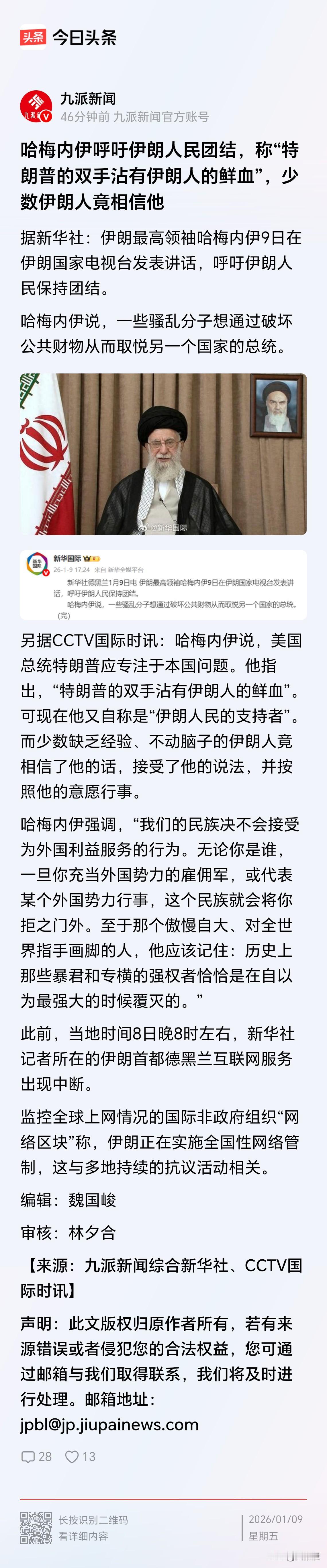 哈梅内伊呼吁伊朗人民团结 称“特朗普的双手沾有伊朗人的鲜血” 少数伊朗人竟相信他