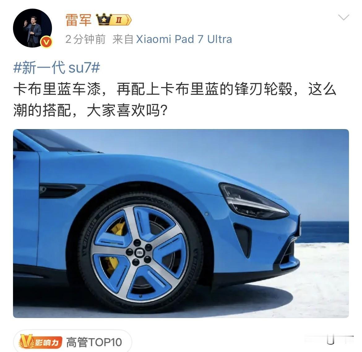 雷军发了新的小米SU7颜色和轮毂搭配! 这次这个颜色就是他们当天晚上直播的时候,这个车的设计师和雷军一起给大家展示的头一个颜色,他们用了一个比较洋气的名字,叫做什么卡布里蓝。 但是今天晚上他把这个配色和这个刀锋轮毂配合起来,看起来确实有不一样的感觉,这种伶俐的轮毂具有辨识度的蓝颜色,看起来有一点撞色的同时,居然还有那么一点点好看。 只是不知道图片中的颜色和现实当中看的这个颜色是不是有差别,这种蓝颜素,其实他们之间如果有微小的差别,那么它的感觉出来是完全不一样的。 还记得保时捷有一款车叫做海风蓝,很多汽车企业都在模仿这个颜色,但是就是没有保时捷调那个颜色舒服,即便是后来有许多同行都在出各种各样的蓝色,取各种各样听上去十分高大上的名字,目前还没有这个蓝色能够超越那个配色。 嘴不知道雷军说的这个蓝色到底是个啥样