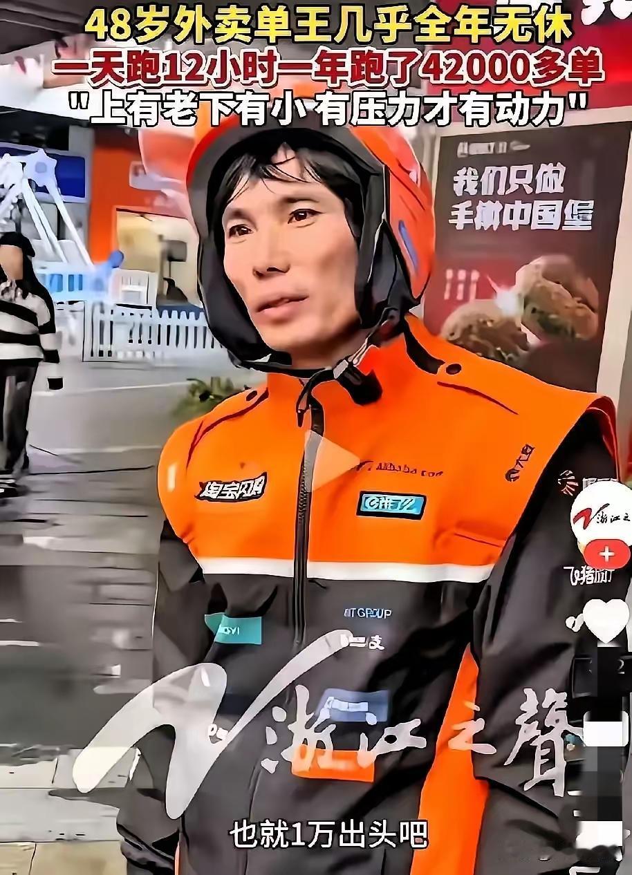 浙江那位48岁的外卖大哥,数据一出来,把我看愣了。 ​全年365天满勤,甚至没有给自己留哪怕一天的喘息。 ​每天雷打不动12小时,风雨无阻,一年狂奔42000单。 ​算下来,平均每天要送115单 ​哪有什么天生爱跑单的“单王”?只不过是被生活逼到了墙角的顶梁柱。 ​网友评论: ​看到这个新闻,我的心情是如此的沉重!为了追求美好的生活而努力的付出,这样的精神是让人赞叹的,但是当我看到这个外卖员的新闻的时候,我感觉他只是为了“活着”。老百姓的生活已经如此的不易,是需要我们社会、政府、工会、民政,相关的所有的部门去反思,去思考的一个问题啊! ​ ​小声问一句,这样的男人是不是劳模?能不能感动中国?顶天立地的男人!为了自己的家人。 ​